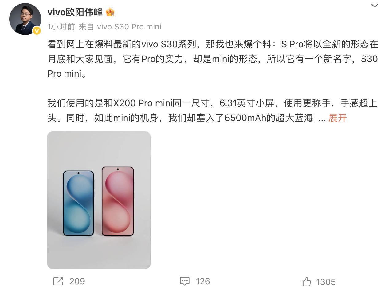 “既Pro又mini的轻薄果味小直屏”这种定位也只有蓝厂做得到,简直就是在X系列夹缝里找个S系列全新定位,vivo S30 Pro mini即将发布,它不仅拥有6.31英寸超mini尺寸的轻薄直屏,更将6500mAh超大蓝海电池塞入小巧机身,可以说同价位里唯一既Pro又mini的小巧轻便手机,同时,全系标配X200s同款潜望长焦,拉满最强小屏旗舰机配置啊,期待期待,相信会是年轻人即要又要的最好选择。
