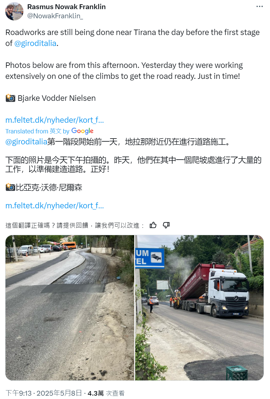 【阿尔巴尼亚速度?】2025环意 开赛在即,丹麦记者前天发现阿尔巴尼亚人还在给第一赛段的赛道铺沥青...抽象...