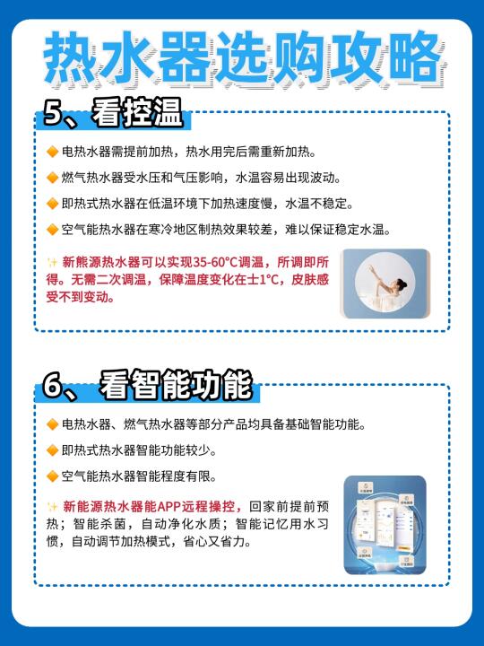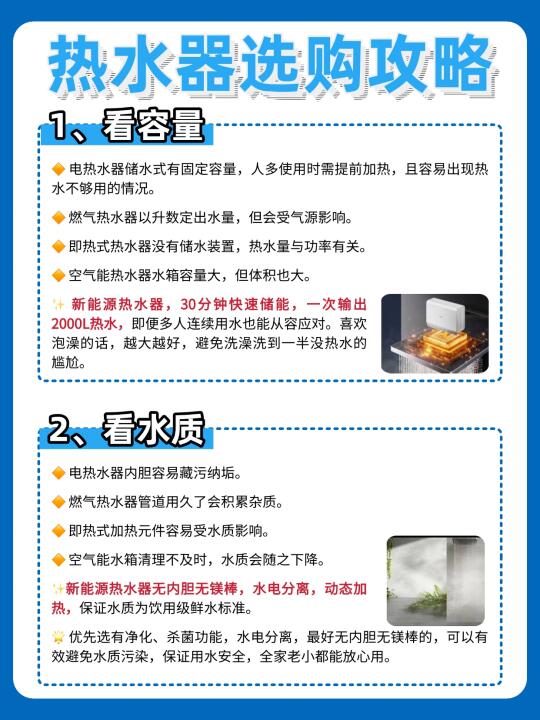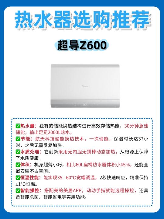 🫵热水器怎么选?不同类型热水器各有千秋,到底热水器哪个牌子好? 燃气热水器还是电热水器好? 别担心,这份热水器选购秘籍帮你缕清思路! ⚡️电热水器 传统电热水器靠牺牲镁棒防腐蚀,但仍需定期清洗内胆或选择带有活水洗功能的,而且容量有限,人多长时间用水需要等待重新加热,反复加热还会增加能耗。 ⚡️燃气热水器 受水压、气压影响,水温波动大,高峰用水时体验差。另外,燃气泄漏等安全隐患需重视,安装需预埋燃气管道。 ⚡️即热式电热水器 对电路功率要求较高,老旧住宅可能难满足。低温环境下加热速度变慢,能耗增加,且热水供应稳定性也欠佳。 ⚡️空气能热水器 体积较大,安装受空间限制。在寒冷地区冬季制热能力下降,需电辅热,性价比不高,维护成本也偏贵。 热水器选购要点看这里👇 ✅看容量 ✅看水质 ✅看能耗 ✅看体积 ✅看控温 ✅看智能功能 👏综合以上要点,我发现一款综合电热、燃热、即热、空气能优点的新能源热水器最近上市了——美的超导Z600热水器 👍30分钟就能快速储能,一次输出2000L热水,连续六小时洗澡也不怕没热水。 👍节能方面更是厉害,采用航天级别的超导储能换热技术,对比传统热水器可以节能40%,一次充能可以保温37个小时,无需反复加热。 👍创新无内胆无内胆无镁棒设计,每一滴水都是饮用级鲜水、也无需后期维护,很适合老人小孩使用。 👍它还超薄小巧,比60L扁桶热水器体积小45% ,装在浴室不占地方。 👍控温超精准,能实现35 - 60℃宽幅调温,精准保持±1℃恒温。 👍用美的美居APP就能智能操控,智能杀菌率达99%。 新能源热水器将会是热水器行业的发展趋势,这个技术太牛了,推荐!感兴趣的可以蹲一蹲618!关于热水器选购还有什么问题,可以留言区问我哈!
