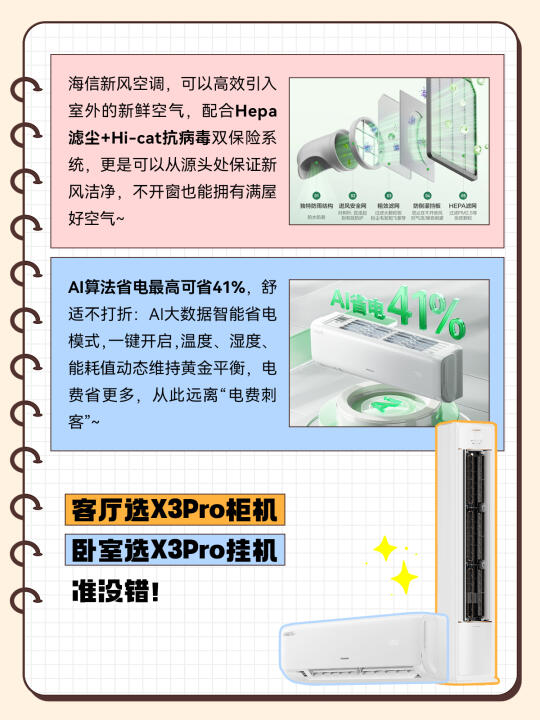 我家用的是海信新风空调X3Pro系列,客厅装的柜机,卧室安的挂机,综合体验都很不错。先说柜机,我家里人没事就喜欢待在客厅,往年开空调,不出两小时屋里就变得很闷,让人忍不住地想大口深呼吸。但现在开一整天也不会有那种感觉了,空气一直很清新。哪怕聚餐吃火锅,味道也散的很快,不会到处弥漫着一股怪味了。