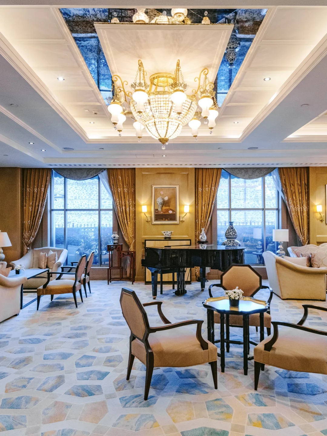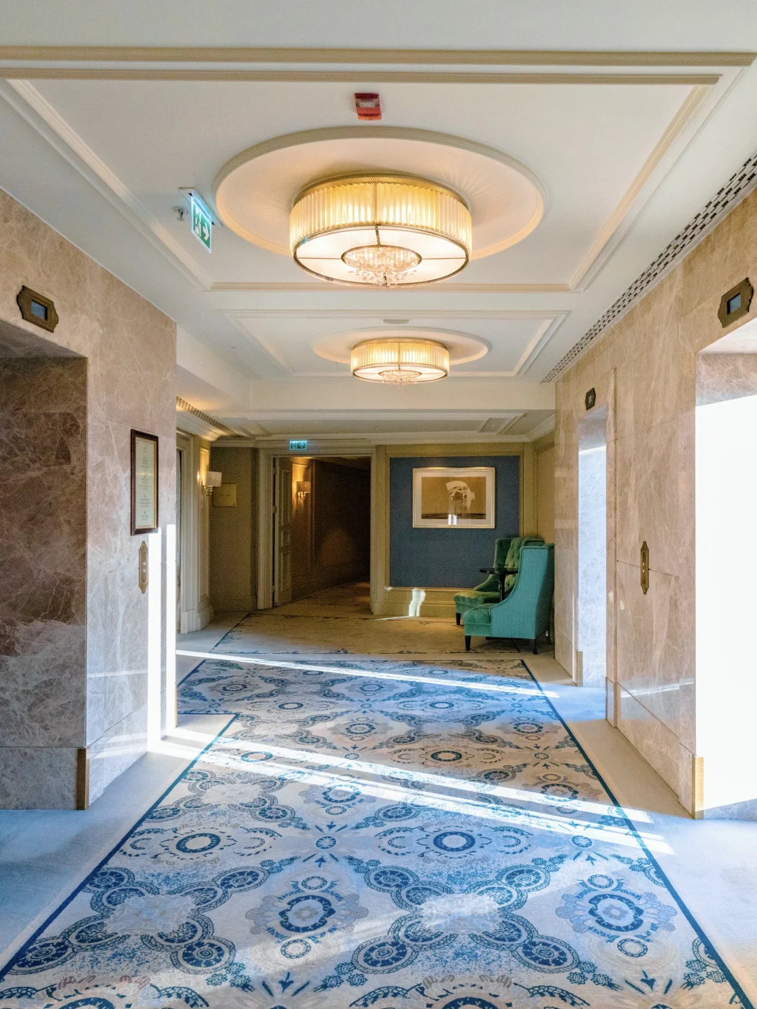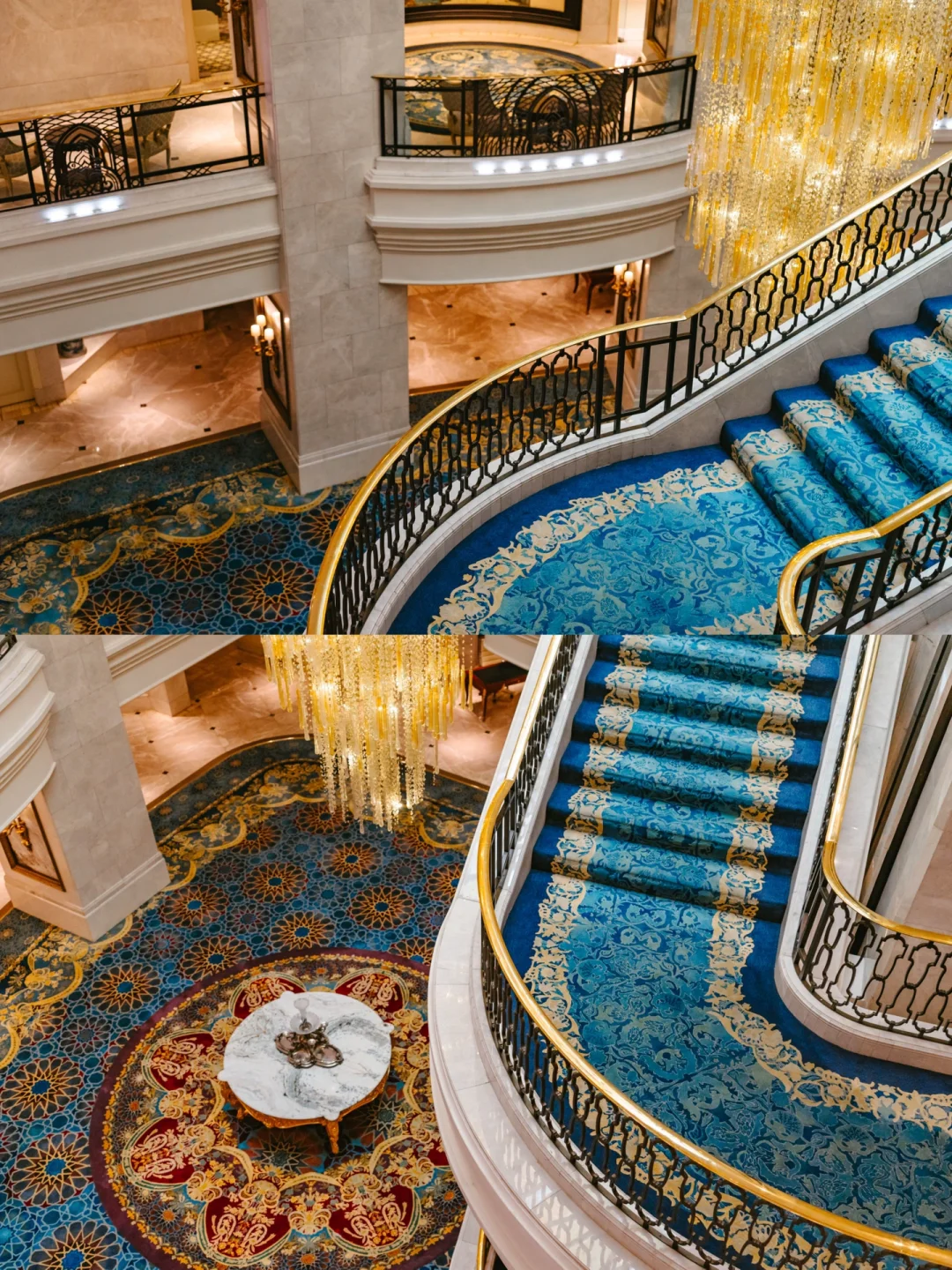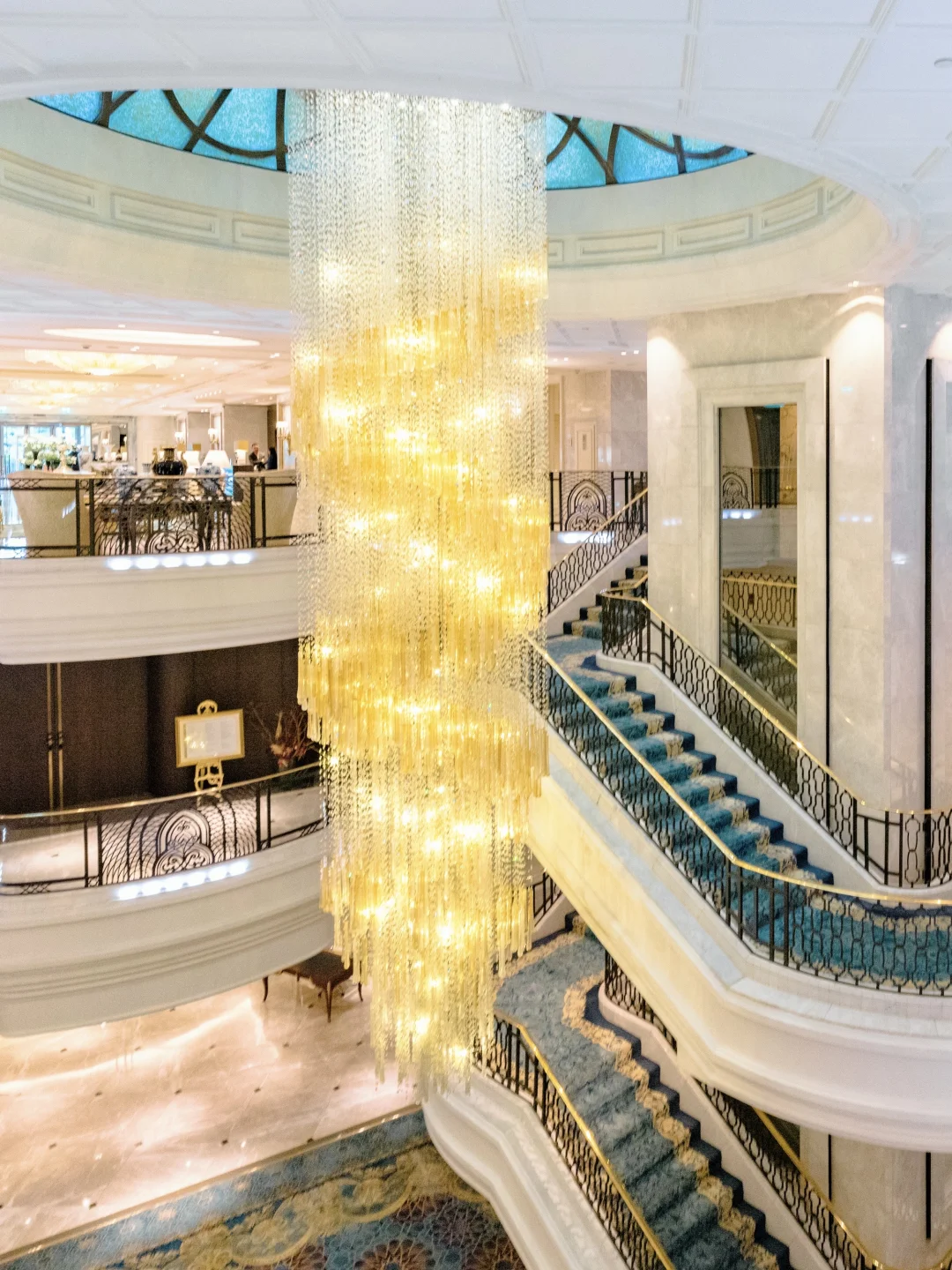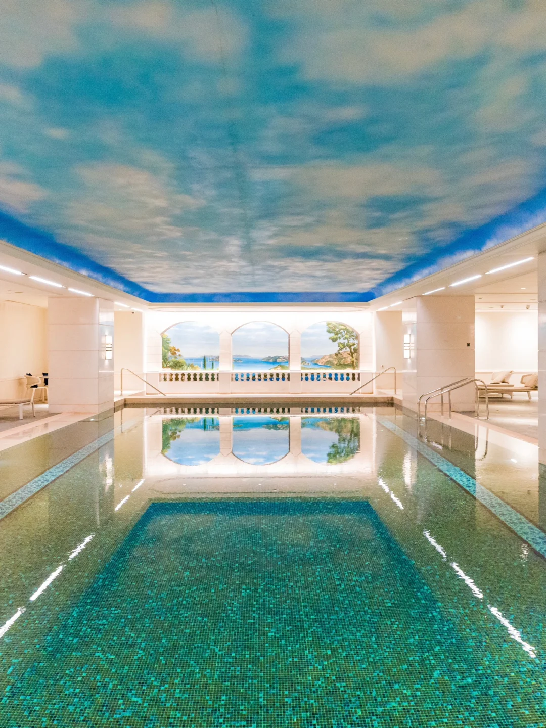 香的前身是建于20世纪30的一栋新古典主义风格六层建筑,以三层高的穹顶中庭为核心,顶部悬挂一座两层高的巨型波西米亚水晶吊灯,形似雨滴倾泻而下,与自然天光交织成璀璨光影。中庭墙面悬挂一幅18米长的丝绸画《桃花源》。室内泳池也好看,以蓝白为基底(象征地中海与天空)。