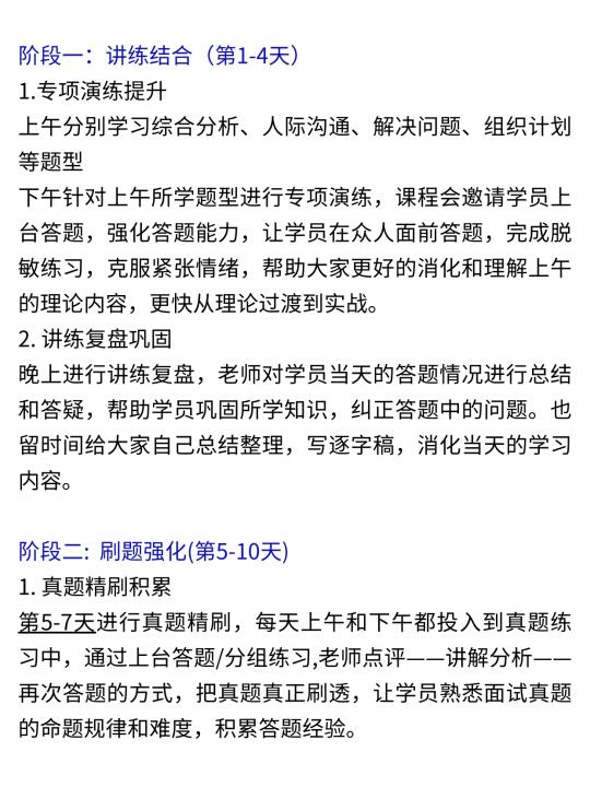 讲练结合、刷题强化、考前模拟三个阶段环环相扣,讲练结合为基础,让学员掌握各类题型答题方法;刷题强化是在基础上增加题量和难度;考前模拟则是对前两个阶段学习成果的实战检验,三者逻辑连贯。