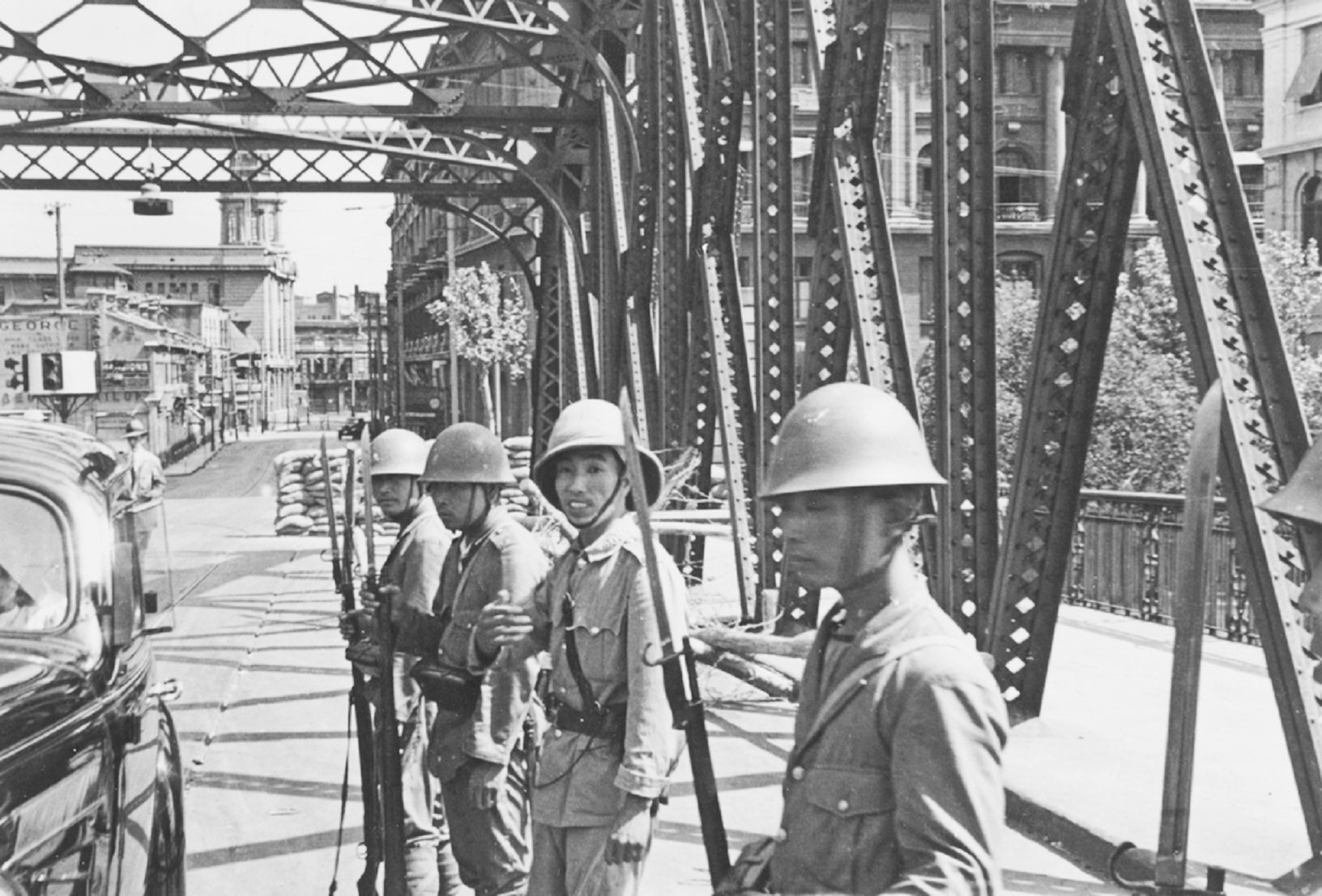 飞扬军事[超话]1937年8月,在上海外白渡桥设卡的日军士兵抗日战争胜利80周