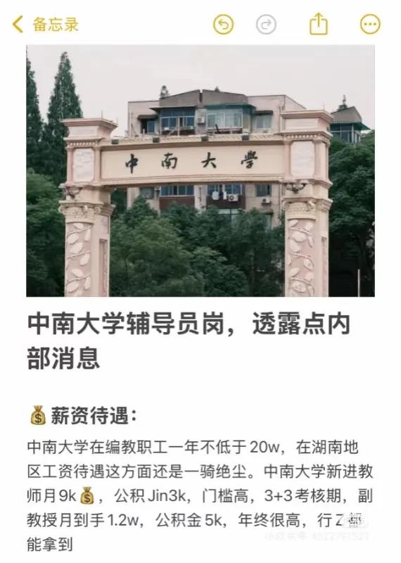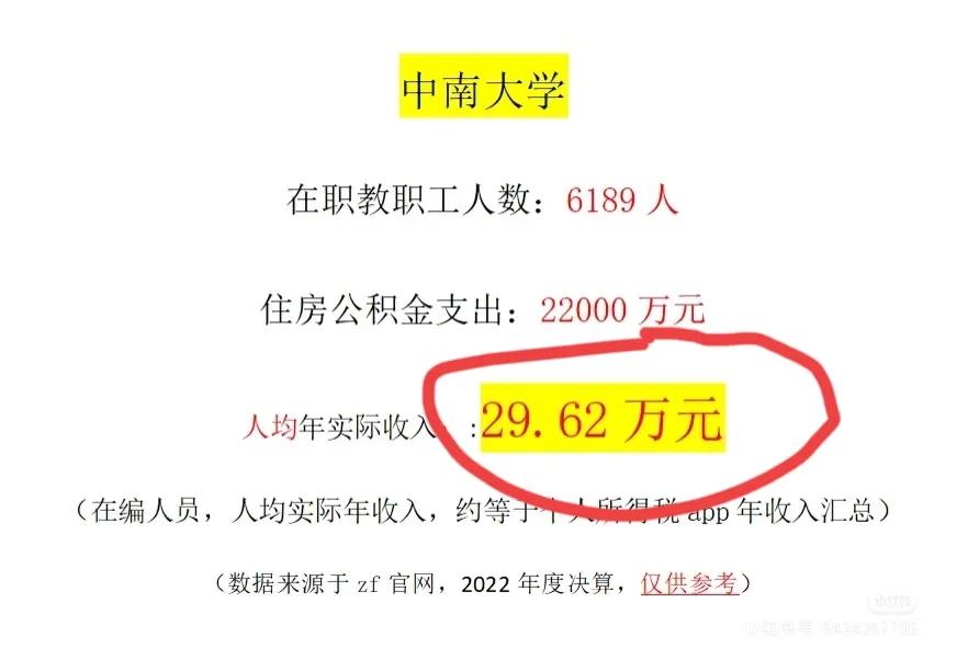 湖南的宝子们找工作都要往中南大学冲,比公务员好太多!中南大学待遇不仅在湖南省是一骑绝尘,鹤立鸡群,放到整个中部甚至全国都是非常令人羡慕的! 大家看中南大学和湖南大学的比较:人均收入这一块,中南大学是29.62万元,湖南大学是21.73万元,中南比湖大多了三分之一! 再看一般在编教职工,中南大学到手都不会低于20万(一般指的行政,教师序列收入更高),这个确实非常诱人,邻省的武大华科行政入职也就17万左右,湖南大学只有15万。 中南大学行政最低起步20万,日后还会根据所在二级单位、职务职称晋升、工龄增长等进一步涨薪,上升空间很大。 就湖南而言,中南大学待遇是秒杀和碾压其它所有高校的,湖南大学入职到手只有15万 ,其它本科院校大概也差不多这个数,专科学校就只有10万了。 要知道邻省的武大华科在编教职工特别是行政的刚开始也就17万起步,中南大学20万已经压其一头了,加上中南大学奖金丰厚,实际差距可能还要大。 所以说,在湖南,在中南大学工作是宝藏级工作,稳定、待遇好、有寒暑假,人际关系简单轻松,比公务员要好得多! 湖南大学 湖南大学排行 湖南薪资 中南大学 中南大学待遇 湖南就业 长沙 就业