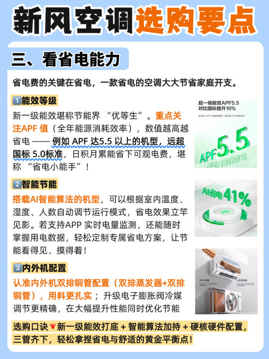 1️⃣选新一级能效的! APF值越高越高,必须≥5.0