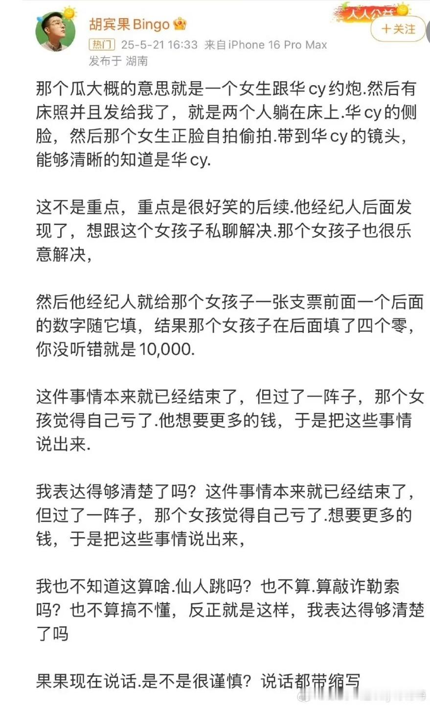 华晨宇胡宾果我想说为什么这么不愿意承认呢,没有空穴来风的事吧,为什么对他要这么