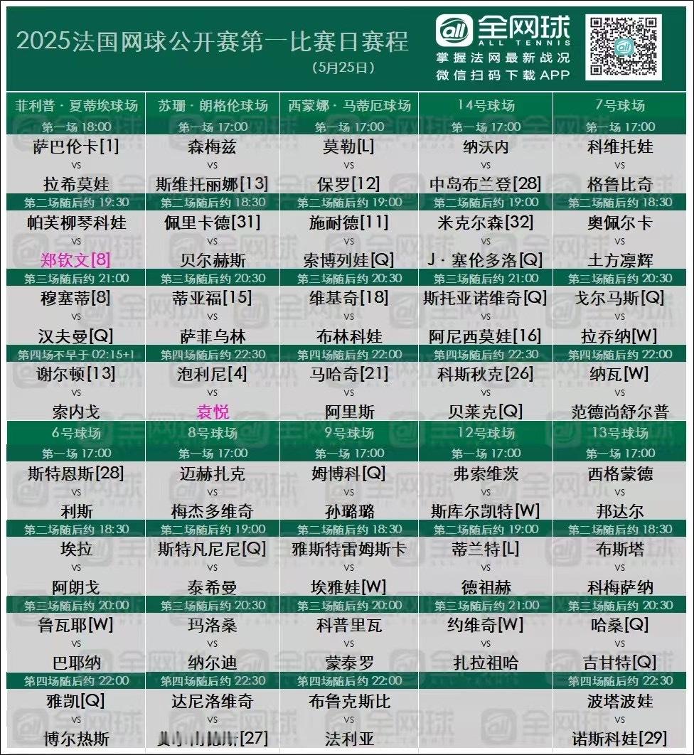 萨巴伦卡、保利尼vs袁悦都是值得观看的比赛