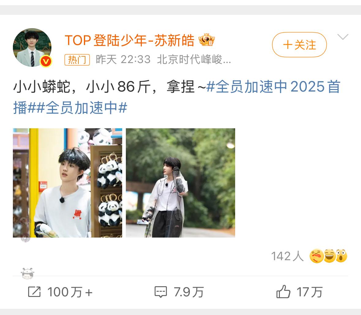 什么?《全员加速中》苏新皓被86斤蟒蛇缠腿?好家伙,参加个综艺体会巨蟒“猎食”,也是出乎意料。 综艺《全员加速中》首播,苏新皓一队人被下达任务,抱起区域内最大的一条蟒蛇,怎想到蟒蛇太长,三人抱起尾巴还落在地上,顺势缠住苏新皓小腿开始绕圈,拍完任务打卡照,工作人员急急为苏新皓解开蟒蛇,目测蟒蛇都已经绕第二圈了,刺激!