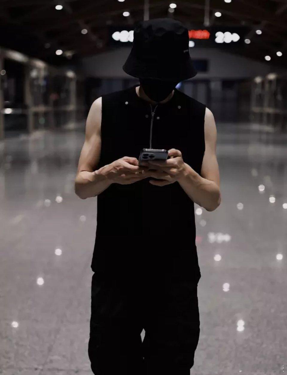 彭昱畅穿黑色无袖背心秀完美肌肉线条,一身黑穿搭酷飒十足,气场全开。