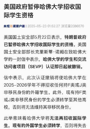 特朗普不仅把哈佛的国际生招收停了,而且还要求已经入读的学生必须转学或者离开美国,不然就算非法滞留。 哈佛大学现有外国学生需转学