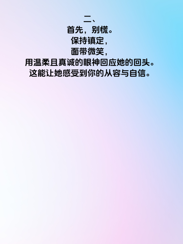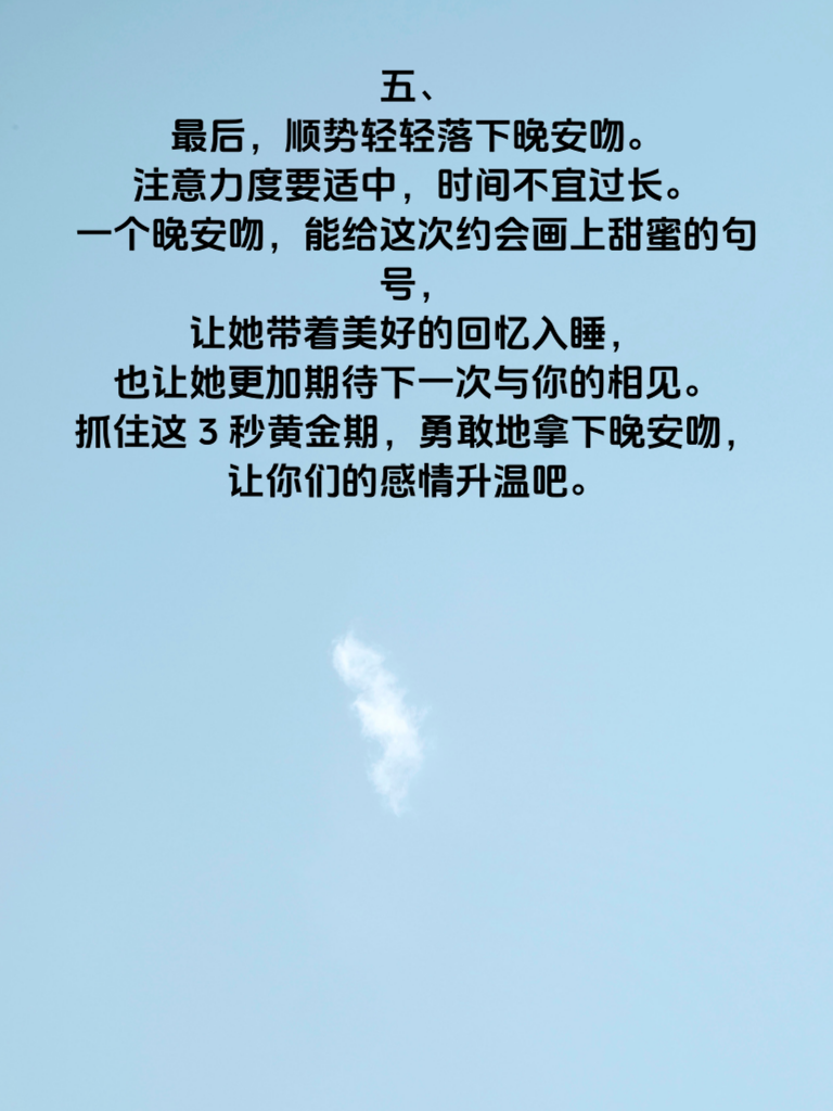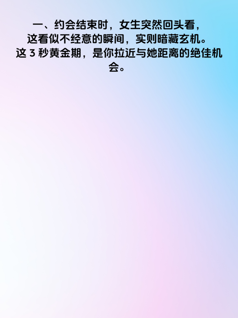 一、约会结束时,女生突然回头看,这看似不经意的瞬间,实则暗藏玄机。这3秒黄金期,是你拉近与她距离的绝佳机会。 二、首先,别慌。保持镇定,面带微笑,用温柔且真诚的眼神回应她的回头。这能让她感受到你的从容与自信。 三、然后,缓缓靠近她一步。注意步伐要轻缓,不要过于急促。轻声询问她今天约会是否开心,让她知道你很在乎她的感受。 四、接着,在合适的时机,微微抬起她的下巴。动作要轻柔,目光专注地看着她的眼睛,真诚地说一些贴心的话,比如‘和你在一起的时光总是那么美好’。 五、最后,顺势轻轻落下晚安吻。注意力度要适中,时间不宜过长。一个晚安吻,能给这次约会画上甜蜜的句号,让她带着美好的回忆入睡,也让她更加期待下一次与你的相见。抓住这3秒黄金期,勇敢地拿下晚安吻,让你们的感情升温吧。