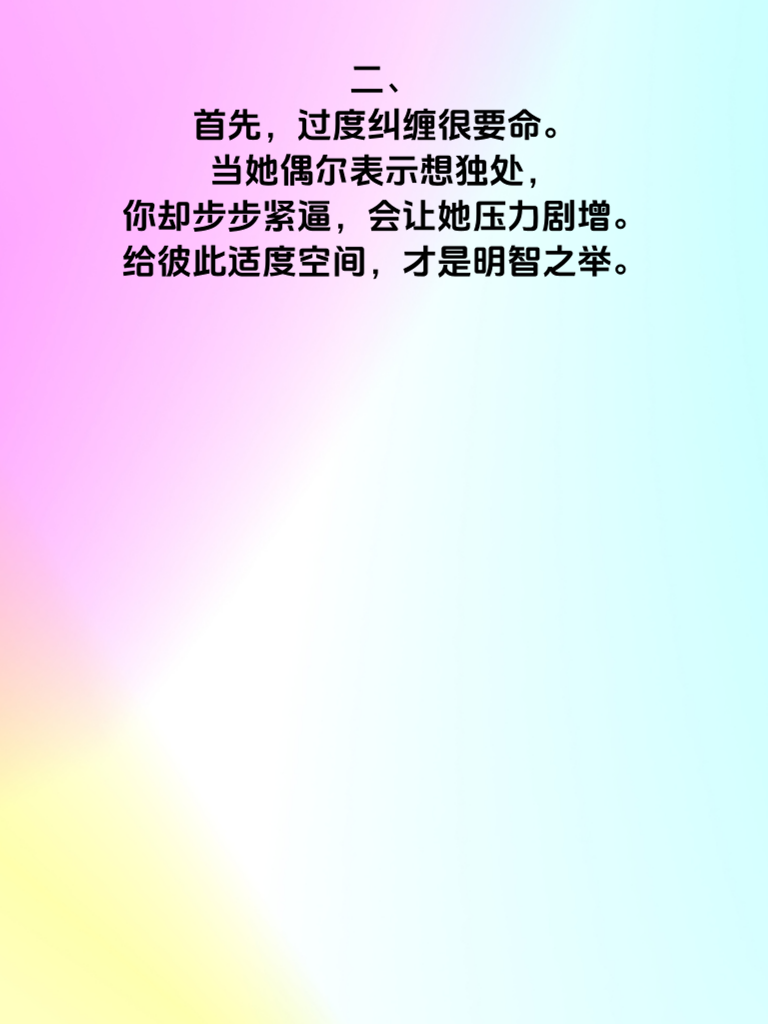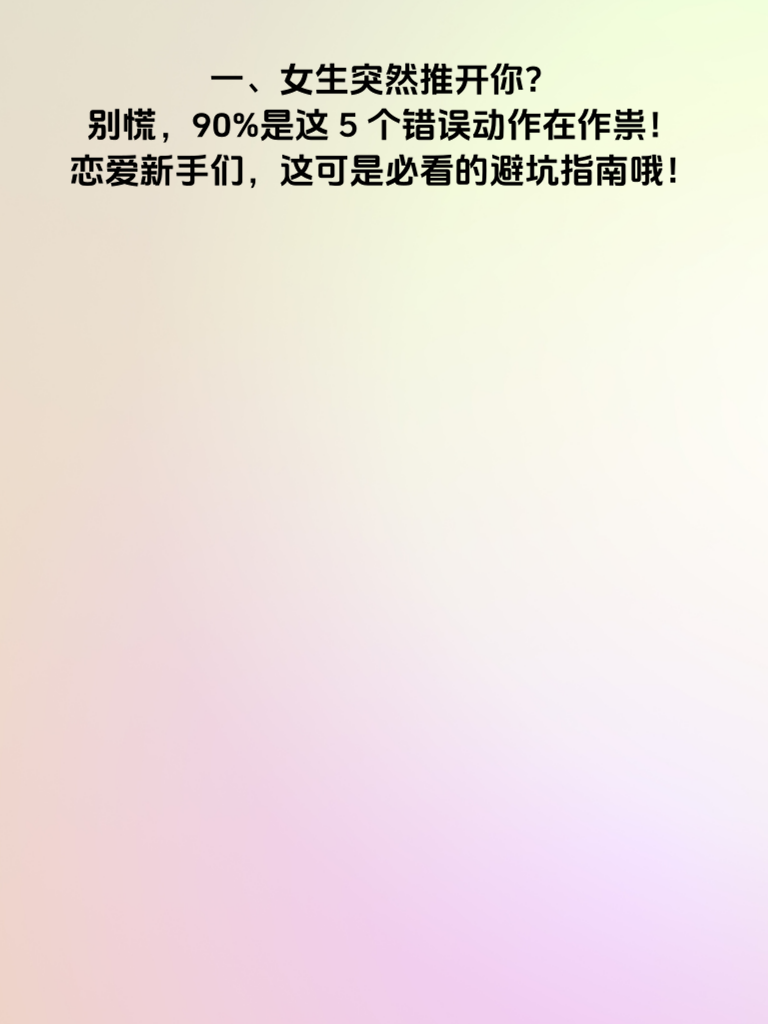 一、女生突然推开你?别慌,90%是这5个错误动作在作祟!恋爱新手们,这可是必看的避坑指南哦! 二、首先,过度纠缠很要命。当她偶尔表示想独处,你却步步紧逼,会让她压力剧增。给彼此适度空间,才是明智之举。 三、再者,过早暴露需求感。刚认识就急着表白或明示好感,会吓跑女生。先以朋友相处,慢慢增进感情。 四、然后,缺乏尊重也不行。不尊重她的意见、爱好,会让她觉得你不理解她。尊重她的一切,她才会更靠近你。 五、还有,不懂情绪价值。聊天乏味,总说自己的事,她会觉得无趣。学会倾听,适时给予关心和安慰。 六、最后,形象管理差也扣分。外表邋遢、言行粗俗,很难吸引她。保持良好形象,展现积极态度。恋爱新手们,避开这些错误动作,让爱情之路更顺畅!