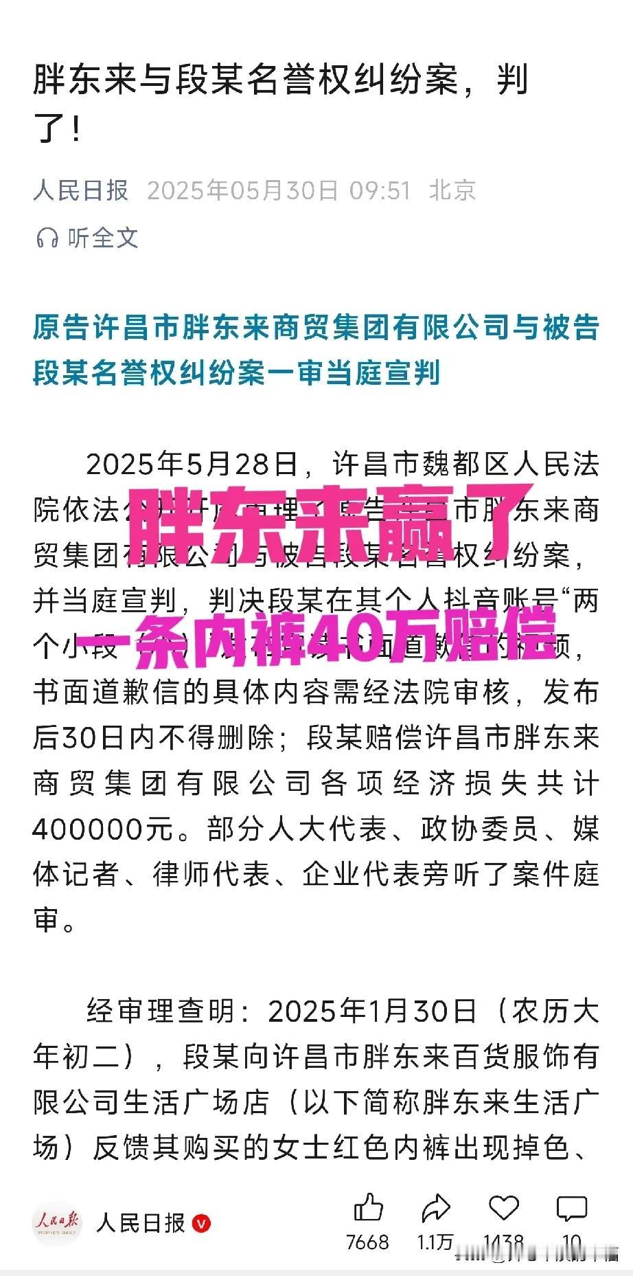 一条红色内裤换来40万的赔偿[比心][比心] 人民日报发了,胖东来赢了[比心] 不能伤了良心企业的心。有力不逾矩句,得意不忘形。每个人都要为自己的言行兜底[比心] 一条内裤,一点赔偿,一点流量,用30天道歉,40万赔偿作为代价,损失有点大[比心] 你不能仗着人家服务好,顾客就是上帝,而无底线,网络更不是法外之地。 胖东来与被告名誉侵权纠纷案,处理的果断及时【人民日报网】