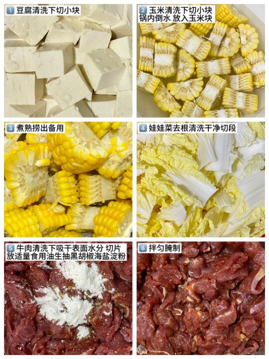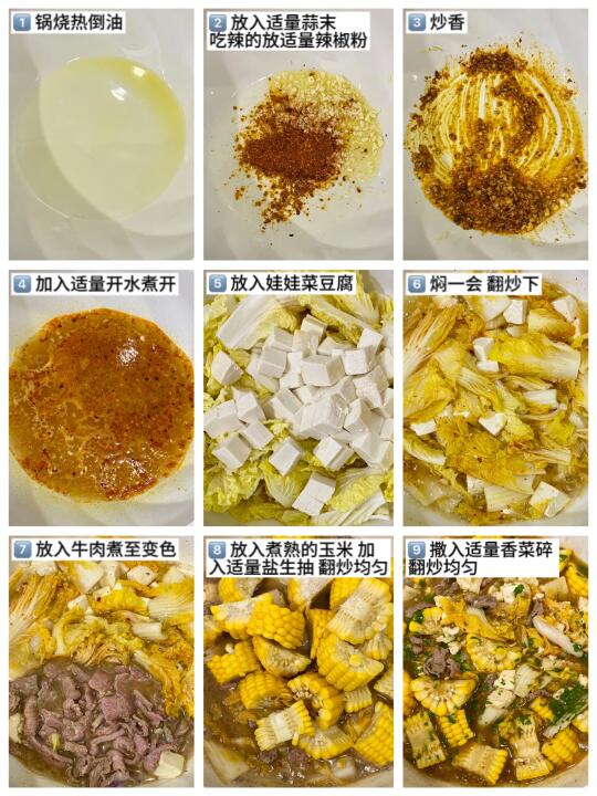 2️⃣ 锅烧热倒油 放入适量蒜末 吃辣的可以放入适量辣椒粉 炒香 加入适量开水煮开 放入娃娃菜豆腐 焖一会 翻炒下 放入牛肉片煮至变色 再放入煮熟的玉米 放入适量盐生抽 翻炒均匀 最后撒入适量香菜碎 翻炒均匀