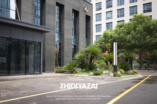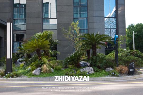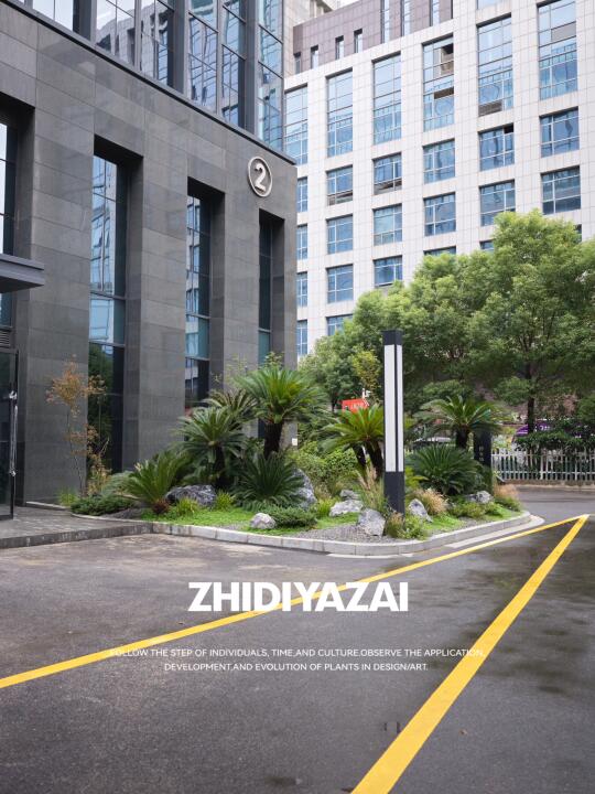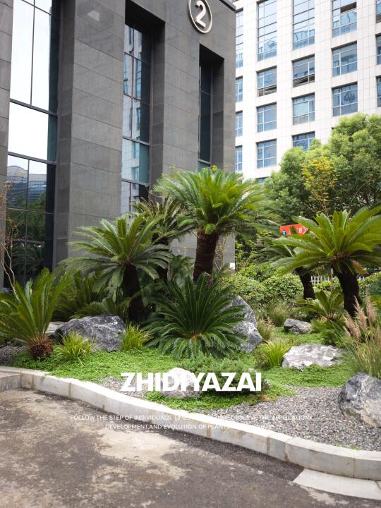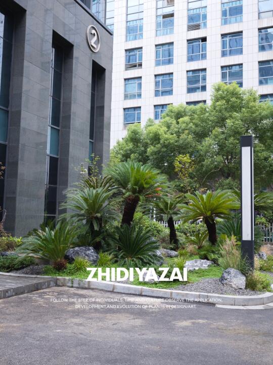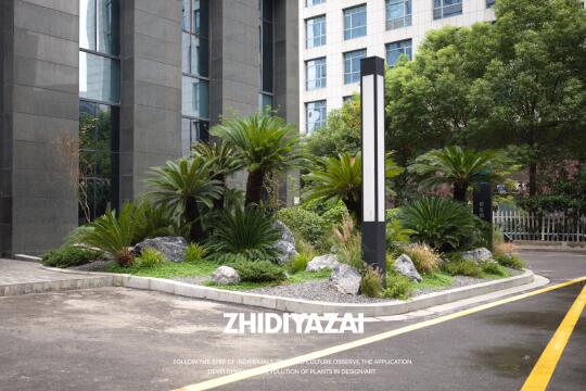 企业大楼入户景观|精神堡垒景观设计一站式打造 以“沉稳、大气、植物即语言”为纲,构筑契合企业调性的现代景观界面。 群生老桩苏铁打造核心主景. 其自古以来坚韧挺拔的形象喻义企业历久弥新,群生形态载协同共生之魂. 苍劲古朴的枝干与现代建筑碰撞,铸就入口雕塑级锚点 较强的材质感营造出高端氛围 苏铁抗逆性强,四季常绿,低维护保障永恒呈现。 以苏铁为核,叠砌岩、草、地被三重肌理,构建自然式秩序层次。 整体景观呈现出“克制而不单调、精致而不繁复”的格调,打造出符合上市公司身份的门前植物迎宾界面。