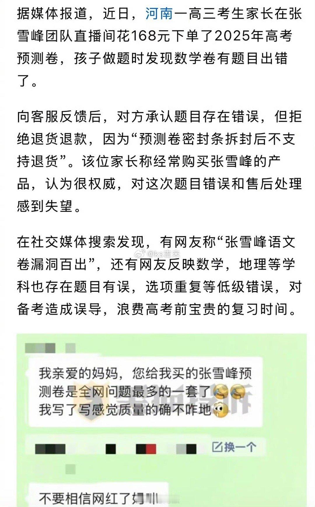 张雪峰168元高考预测卷被指漏洞百出,客服承认题目错误,但拒绝退货退款。[允悲]高考加油