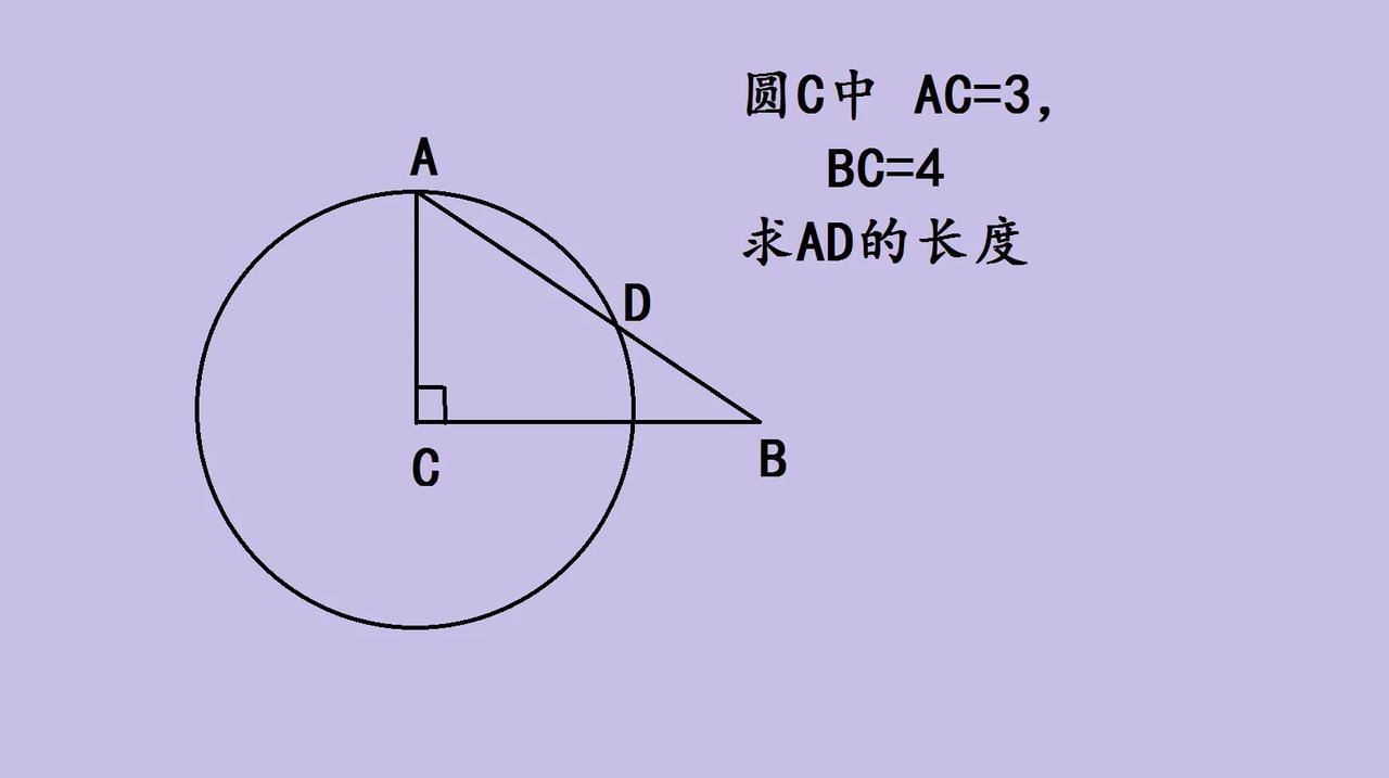 延长AC至圆边E、连接DE、可得AED相似ABC 由图中条件可知三角形ACD为直角三角形、勾股定理可得AB=5 利用相似从而可解AD=3.6