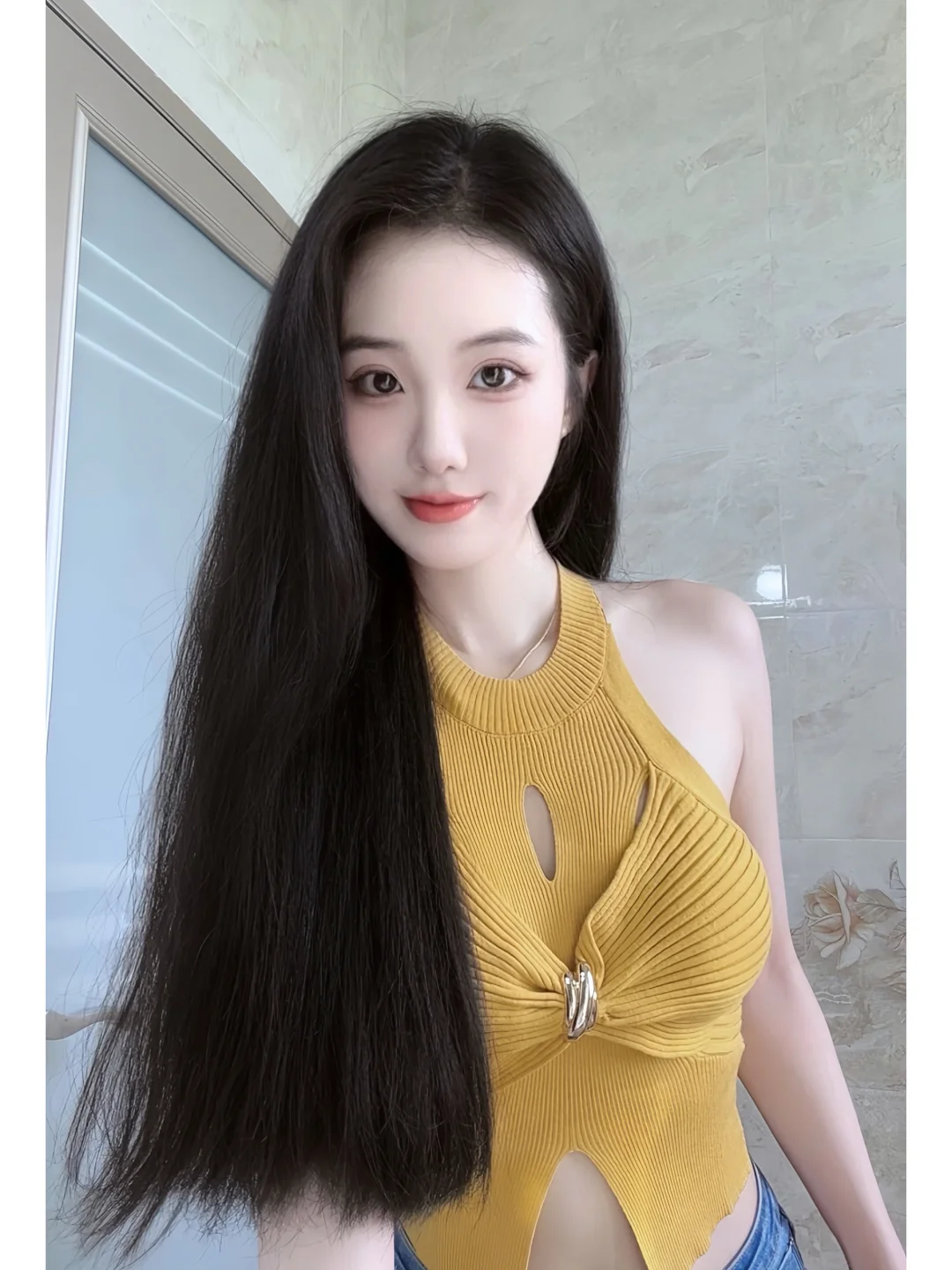 阳光下的她像是从画里走出来的人——长发顺着肩线垂成温柔的弧度,蕾丝抹胸衬得肩颈线