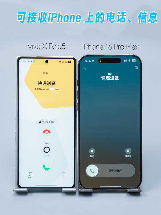 [喝奶茶R]3.vivo X Fold5和 iPhone 打通通讯,可以直接接听对方的电话和接收信息,这点对双持机的小伙伴就很友好
