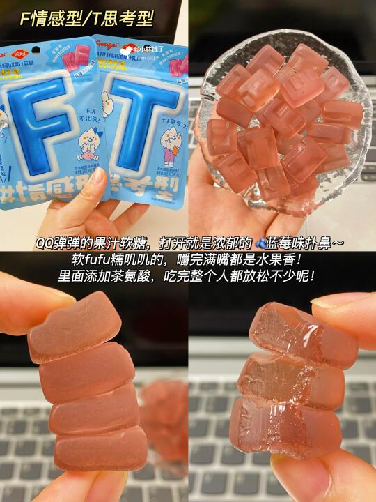 ✅F情感型/T思考型:QQ弹弹的果汁软糖,打开就是浓郁的🫐蓝莓味扑鼻~软fufu糯叽叽的,嚼完满嘴都是水果香!里面添加茶氨酸,吃完整个人都放松不少呢!