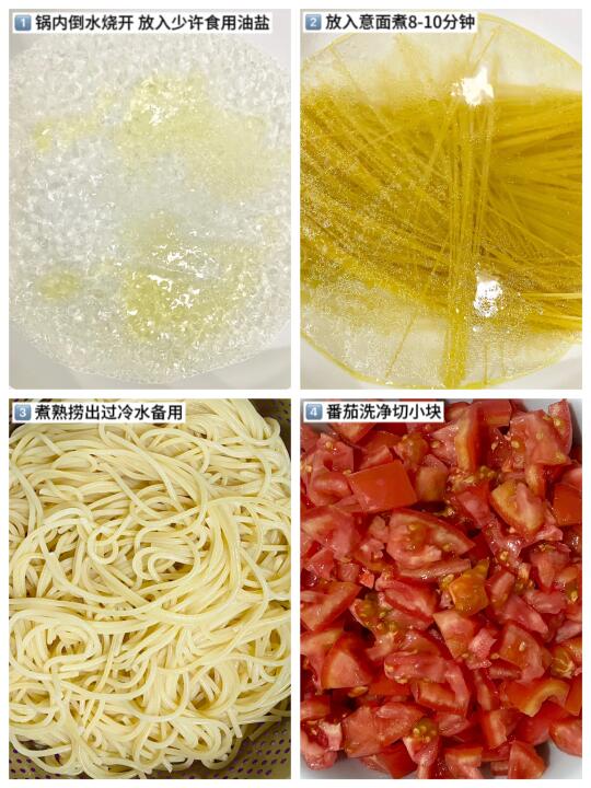 1️⃣ 番茄洗净切小块备用 锅内倒水烧开 放入少许食用油盐 放入意面 煮8-10分钟 捞出过冷水备用