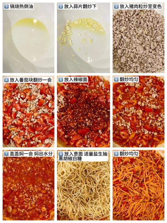 2️⃣ 锅烧热倒油 放入蒜片翻炒下 放入猪肉粒炒至变色 放入番茄块翻炒一会 放入辣椒面 翻炒均匀 盖盖焖一会 焖出水分 放入意面 放入适量盐生抽黑胡椒白糖 翻炒均匀