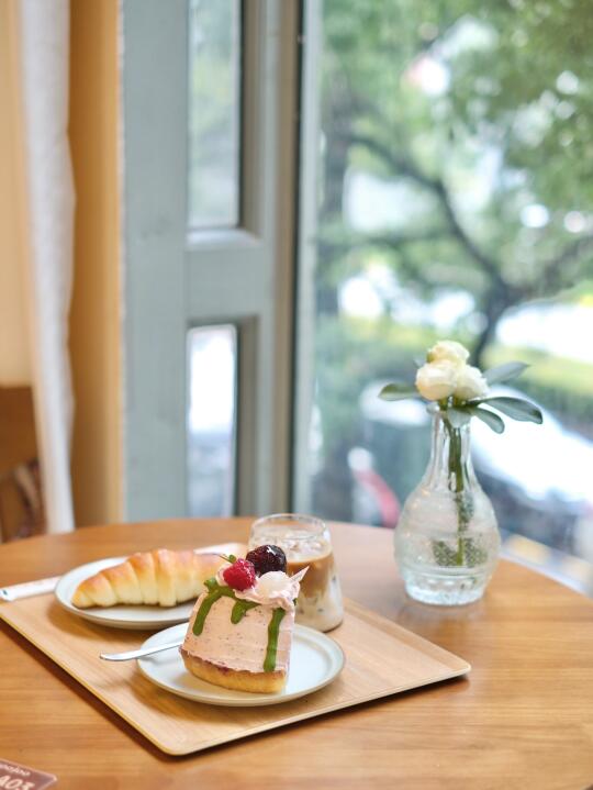 去喜欢的店买面包 发现二楼座位可以看到大片绿植 点上一份应季的杨梅荔枝蛋糕 被丰富的层次惊艳到了 海盐卷还是一如既往的松软好吃 和对象边吃边聊天 时而望向窗外的绿色洗眼睛 舒服打发一个梅雨季的下午时光
