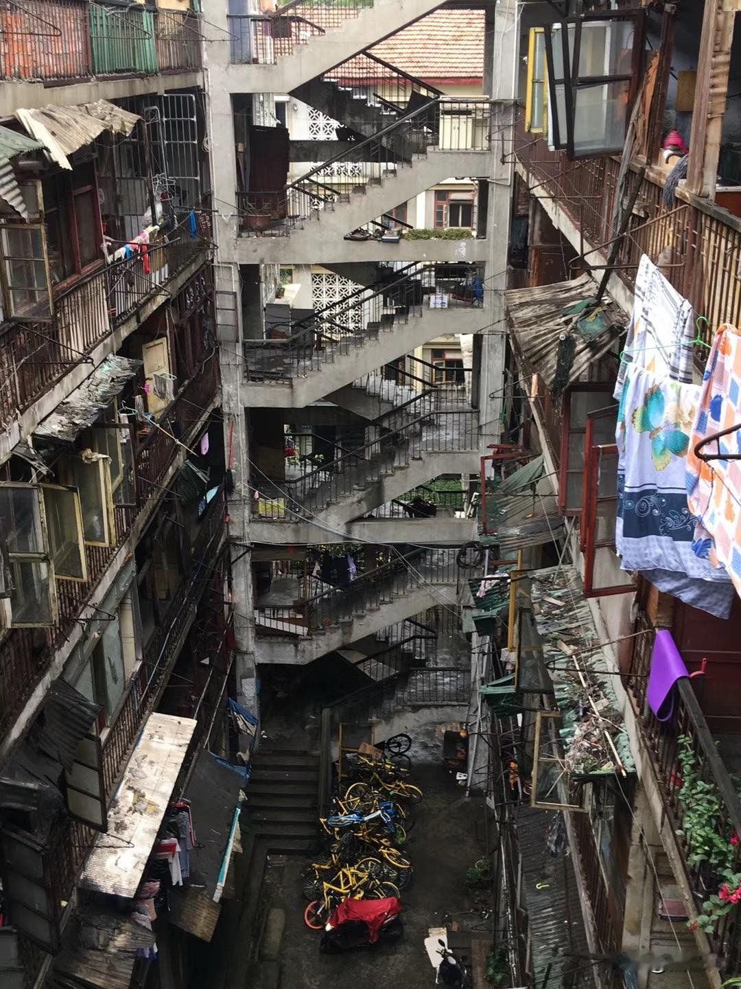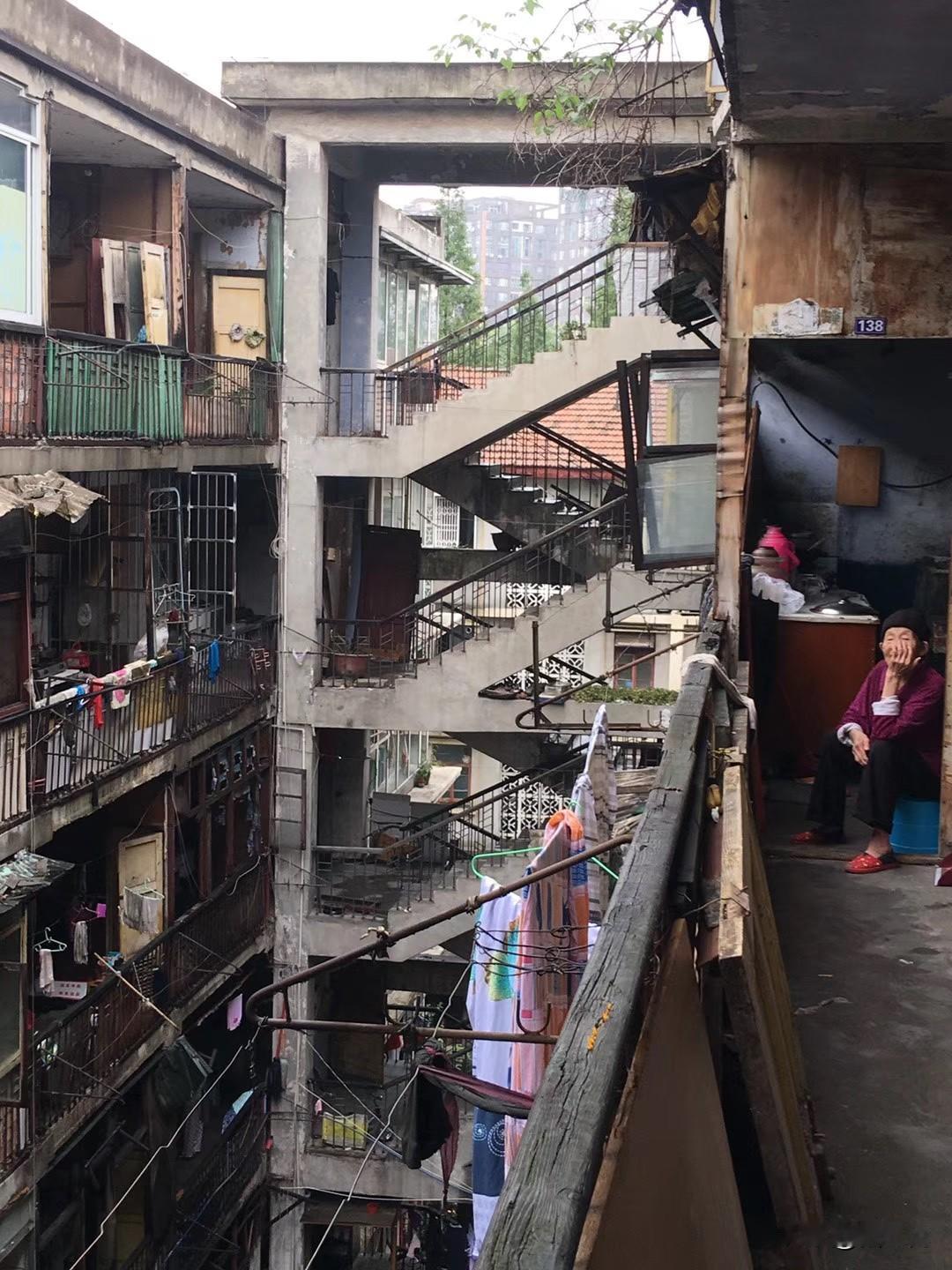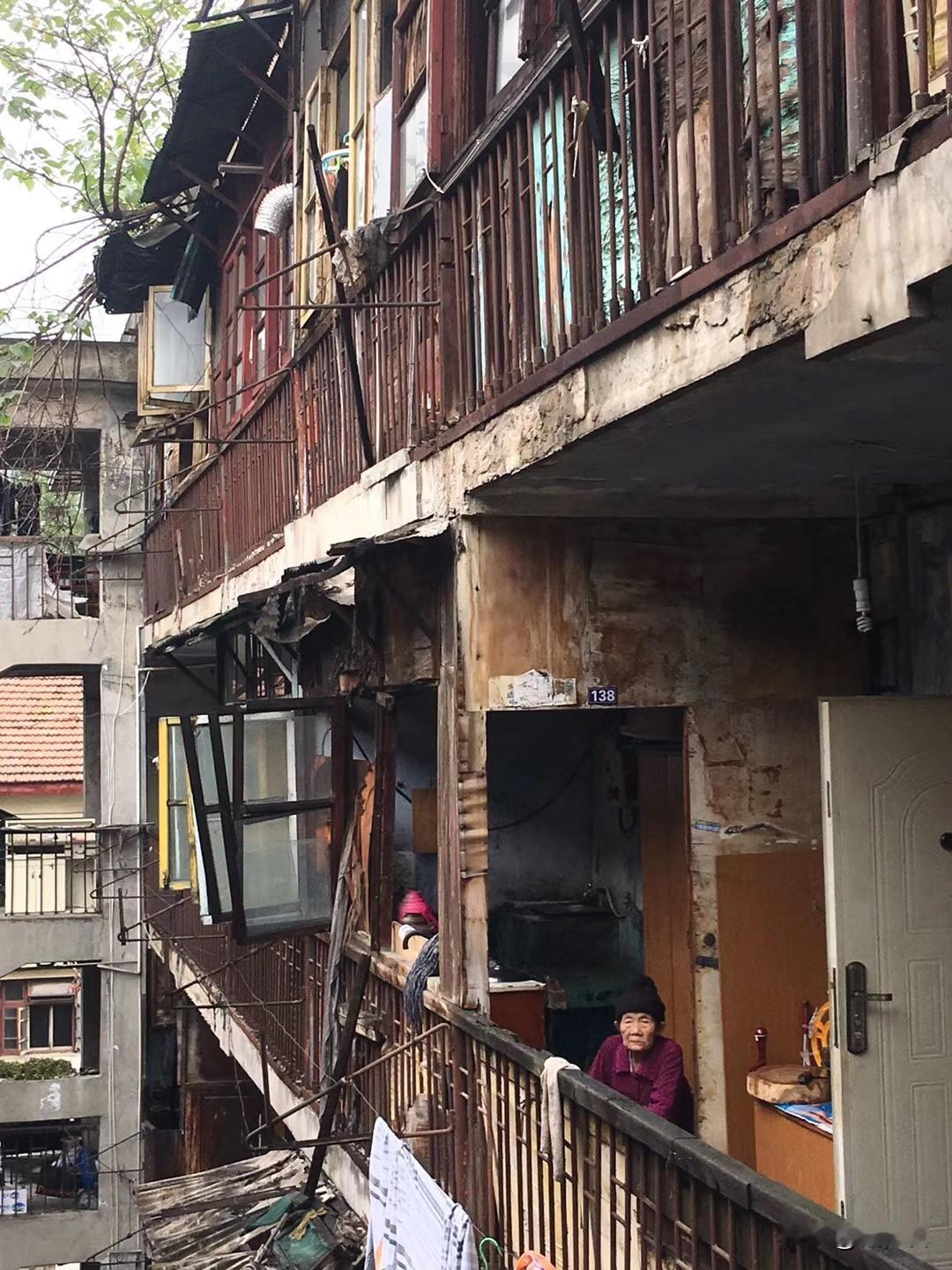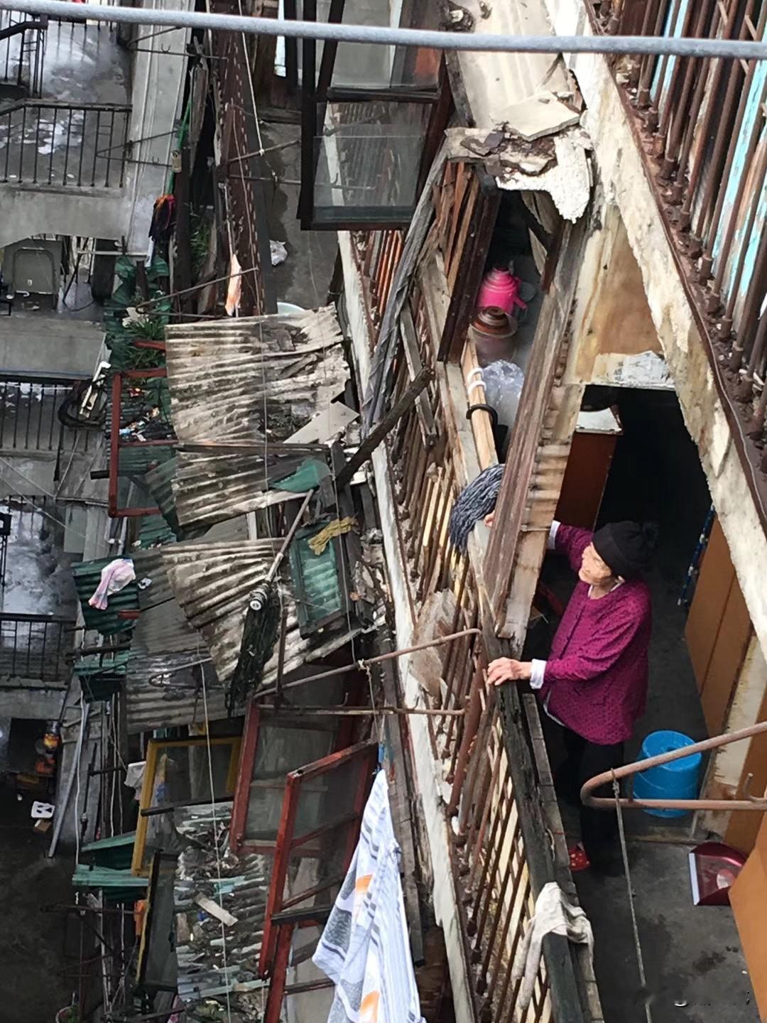 鸳鸯楼——成都的“七十二家房客”。 刚过晌午。 就遇到了这位90多岁的老婆婆,她孤独地坐在门口,向我们搭讪,问我们吃少午没有。 这个被儿媳妇嫌弃的婆婆有五个儿子和三个女儿,老家在兴隆场,跟随小儿子过来吃“零囧”。今天儿媳妇又打骂了婆婆,婆婆的委屈不知向谁诉说。 我们蹲下身来,听婆婆耳语着诉说委屈。她觉得耽误了我们的时间,很是自责地说:让你们操心了。 我们爬上天台,抽烟、吹风、听鸽哨、闻每家每户飘来的麻婆豆腐的香气。 一棵黄桷树的老根正从筒子楼的缝隙里倔强地生长。 他们倔强地自由生长,在最深的缝隙里!无力无奈,连同情都难以释放!只因为那不是个体,那是一个阶层,这就是生活本身。 旧七十二家房客
