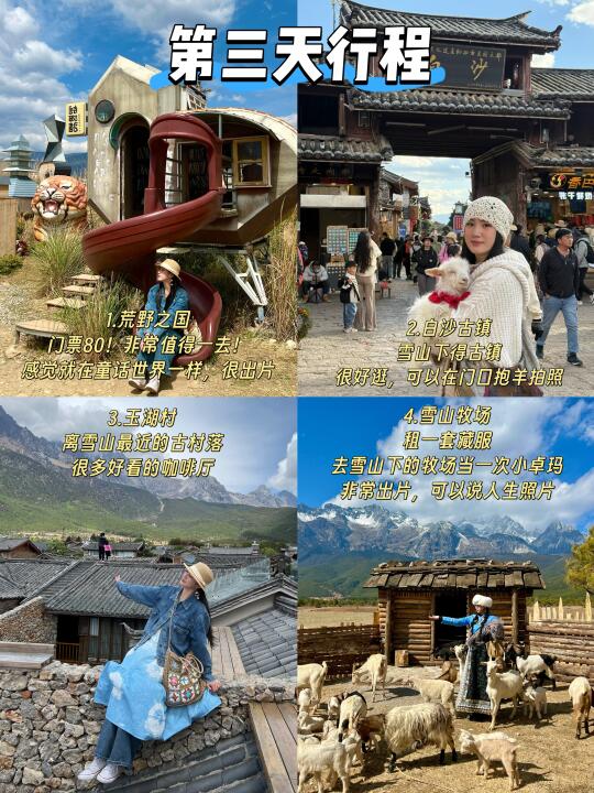 第一天:丽江古城~忠义夜市~木府~大水车~四方街~狮子山 第二天:甘海子~云杉坪~蓝月谷~玉龙雪山 (牦牛坪没办法安排到一个行程,时间会很赶) 第三天:荒野之国~白沙古镇~玉湖村~雪山牧场 云南旅游丽江旅游丽江古城丽江美食丽江旅游攻略丽江美食推荐云南旅游攻略玉龙雪山白沙古镇白沙古镇美食