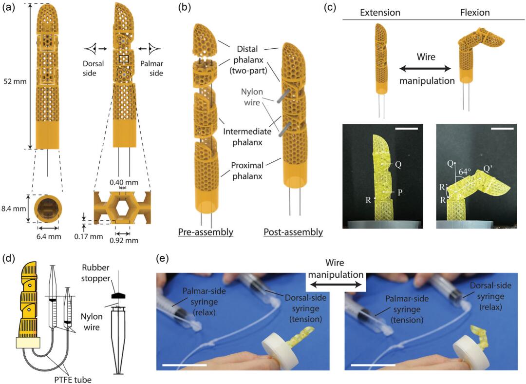 机器骨骼采用空心结构设计,表面设有条形狭缝或大量六边形排列的蜂窝状穿孔。这种结构允许培养基从内部向外流动,便于营养物质输送与代谢废物排出。以蜂窝状穿孔手指为例。该骨骼由三部分组成:远端指骨、中间指骨和近端指骨。所有骨骼组件均通过3D打印技术制备而成。制备材料采用了HTL光固化树脂,其拉伸强度为71.5MPa,这种更高的拉伸强度弥补了密集穿孔导致的结构完整性损失,确保了线驱关节运动的有效性且无结构损伤。