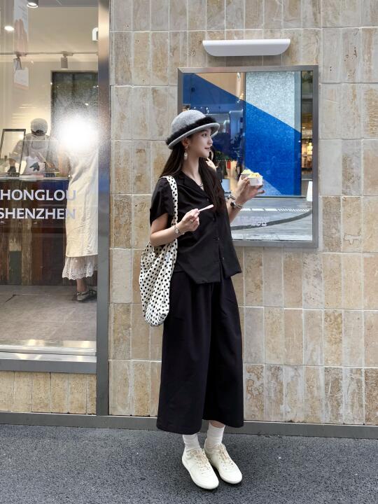 这家新中式茶馆也太会拿捏氛围了!亮面黑外套+黑丝的搭配,又酷又撩,露肩设计刚好中