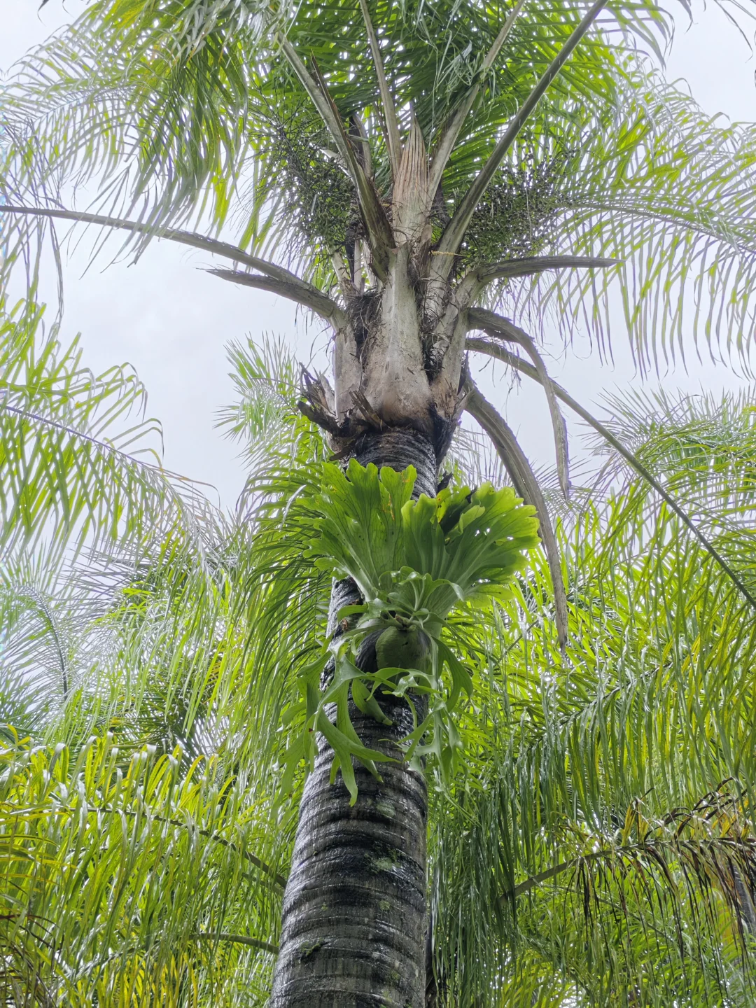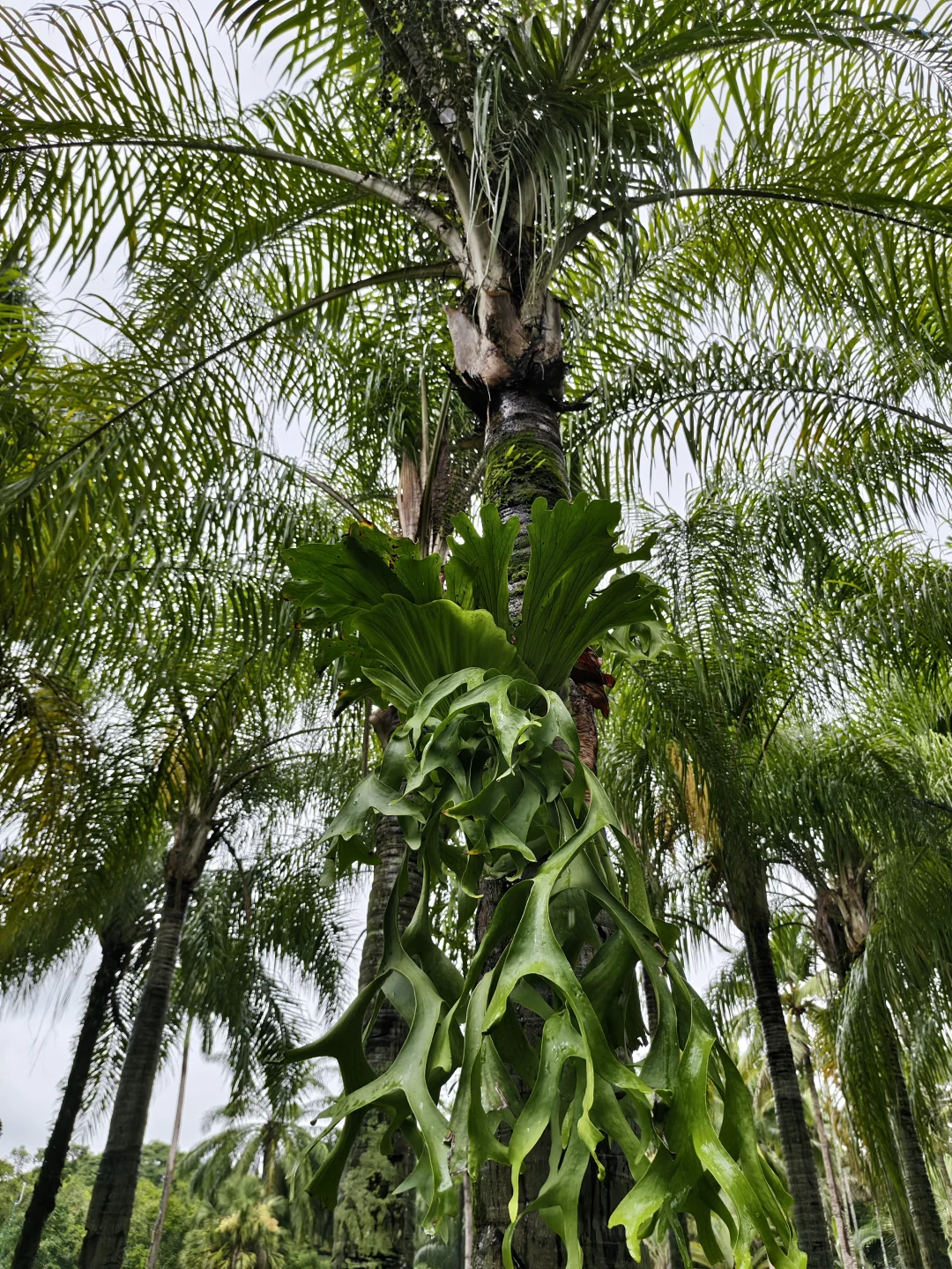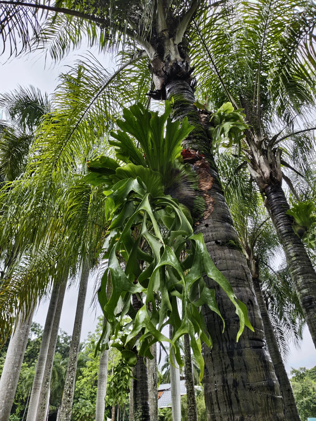 西双版纳植物园王莲池附近的很多棕榈树上都有鹿角蕨,凑近一看品相还真不错。部分有些黑脸,估计还是会雨水太多导致的,但冠长得很好。近期正值雨季,一天下几场雨,户外的鹿角蕨想必基部是用的树皮或者椰糠这种透气性极好的植料,而非水苔。