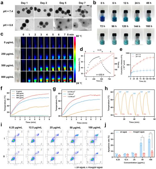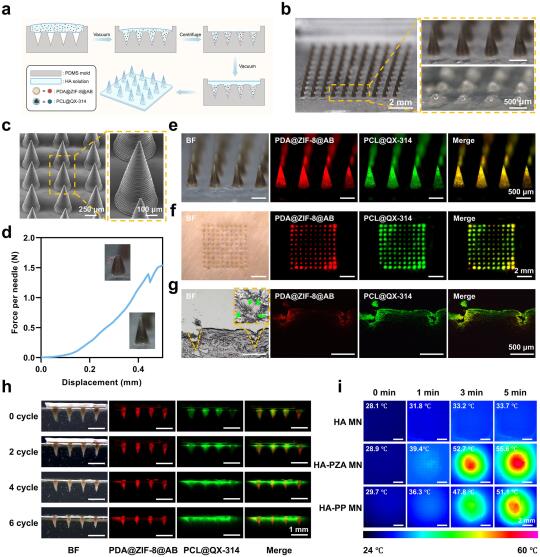 该系统的核心是通过聚多巴胺(PDA)修饰的AB纳米粒子,结合温度响应型聚己内酯(PCL)微球,负载于透明质酸基质的可溶性微针贴片中,可在酸性微环境中持续释放H2并通过近红外(NIR)光热效应控制药物释放。其中,该微针贴片(HA-PP MN patch)是利用3D打印设备加工模具后经PDMS翻模制备而成的。研究发现,PDA