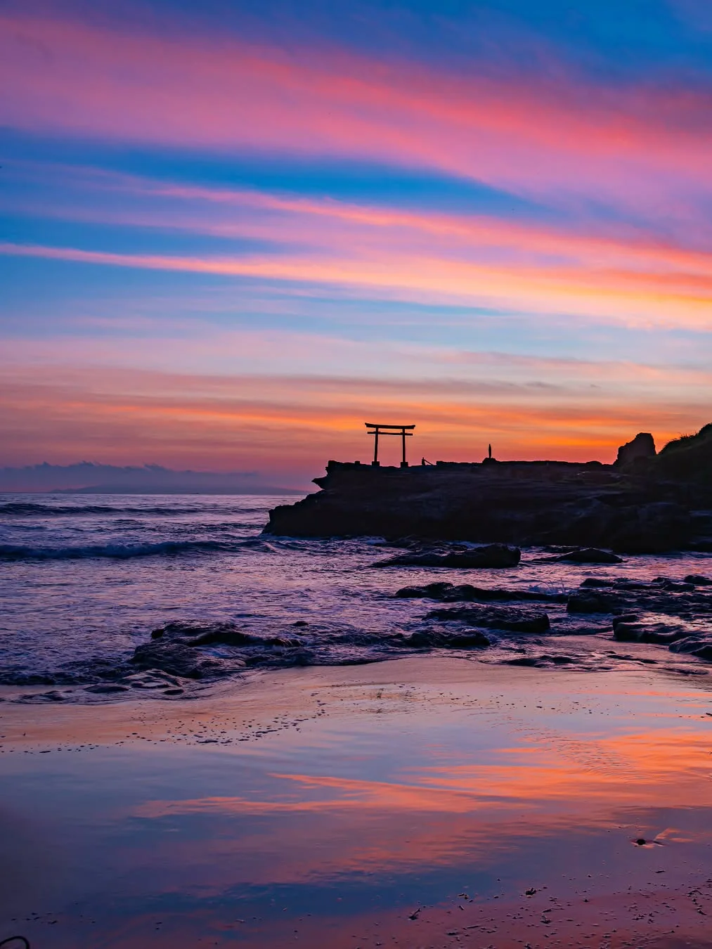 这片海里面有几个形状特别的岩石,夕阳落日和岩石的剪影。我们上面说,西伊豆提出“日本第一夕阳海岸”的口号,一部分原因就是因为大田子。
