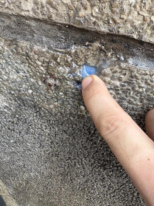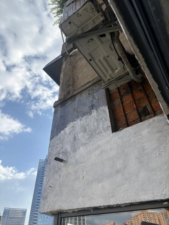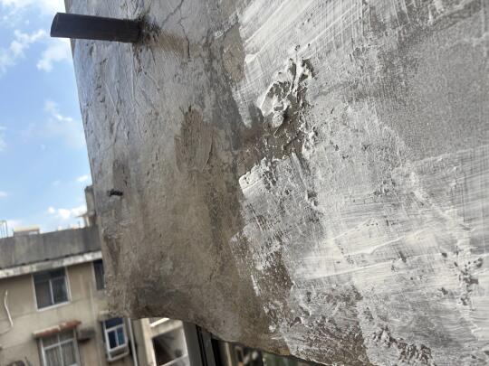 [失望R]原来是楼上开了空调,水管自由飘在外面没受束缚,水滴顺着阳台外沿流下来。老房子的外墙不那么防水,而且我阳台上面以前有雨棚,装修拆了,有一些钉子还在外面留着,有一处墙还缺了一口(图7,已经补过后的),估计水滴一直流了一晚上就浸透进来了[捂脸R]