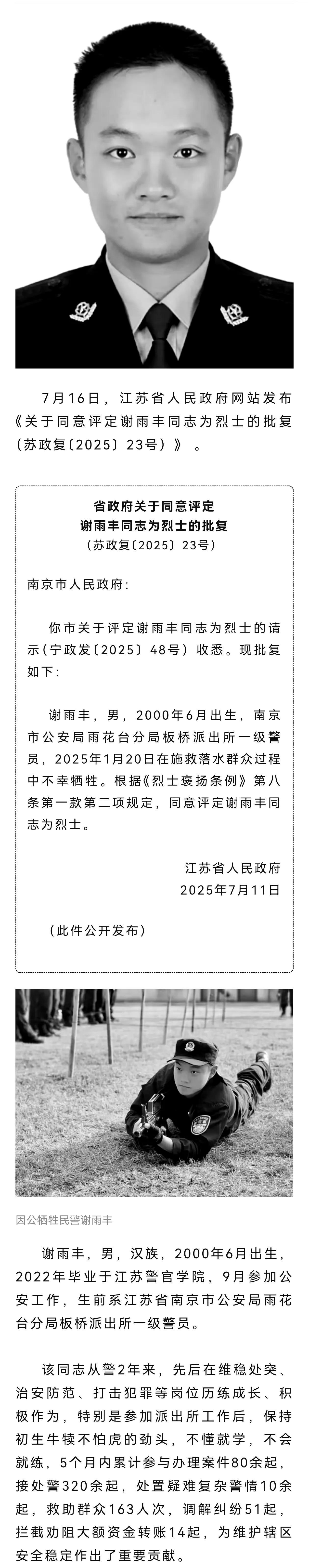 2000年6月出生的谢雨丰,2022年从江苏警官学院毕业后投身公安工作,生前是南京市公安局雨花台分局板桥派出所一级警员。2025年1月20日凌晨,他在接处警时为救轻生男子,不顾自身安危跳入寒冬的河中,不幸牺牲。7月16日,江苏省人民政府依据《烈士褒扬条例》,同意评定谢雨丰为烈士。致敬公安英雄![蜡烛]