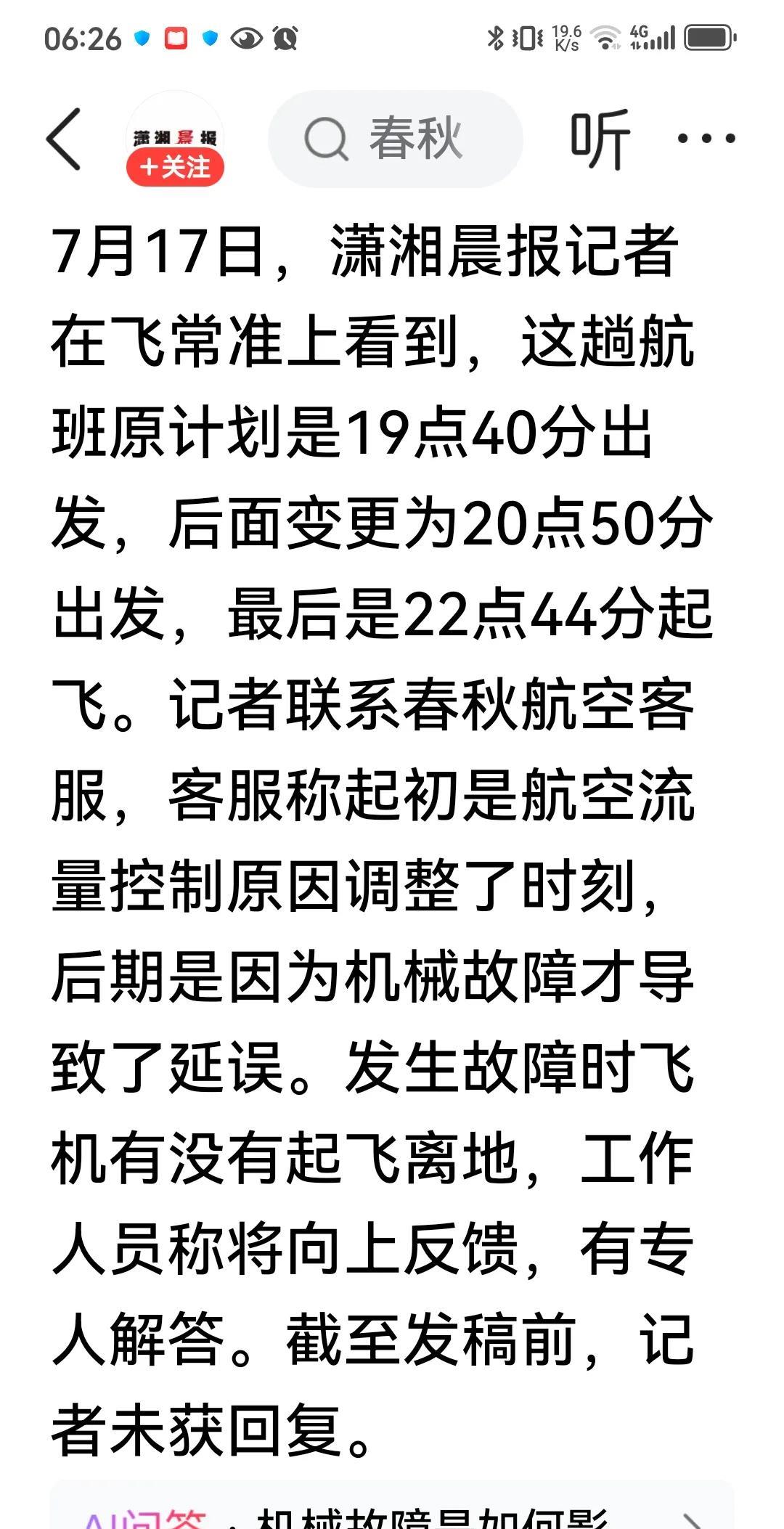 赶紧烧香,飞机起飞离地后发生故障“砸下来”——这个航班上的人是幸运的! 《潇湘晨报》报道,春秋航空一航班疑起飞离地后发生故障“砸下来”落地,航司回应:先是空中管制,后是机械故障。 是不是细思极恐?如果不是开始的空中管制,如果这架飞机如常起飞后发生机械故障那后果又是怎样的? 我说,这班飞机上的乘客是幸运的,尽管航班延误了。我虽然不迷信,但是,还是觉得这一群乘客还是该烧个高香。 不过呢,这飞机驾驶员也还算是处置果断,否则,一旦起飞,后果不堪设想。更重要的是,航空公司应该给出个明确的说法,否则的话,谁还敢乘坐你家的航班。