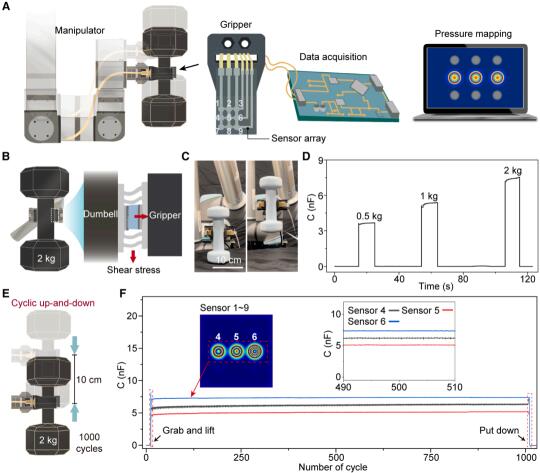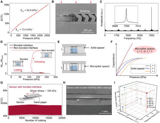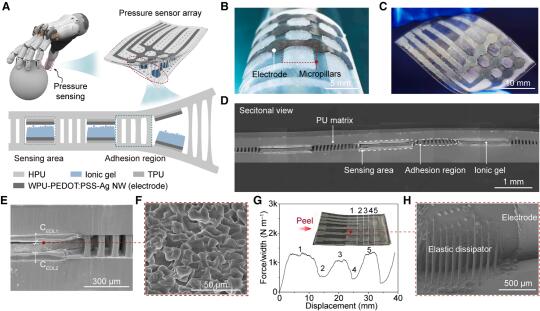 柔性触觉传感器是构建智能机器人、可穿戴设备与人机交互系统的关键基础器件。面对高剪切应力、大变形等复杂工况,多层柔性传感器器件常面临界面脱层、信号不稳定等技术瓶颈。为实现“既牢固又灵敏”的性能兼顾,南方科技大学郭传飞教授团队创新性地引入超支化聚氨酯(HPU)微柱作为界面结构,显著提升了器件的力学稳定性与响应性能。