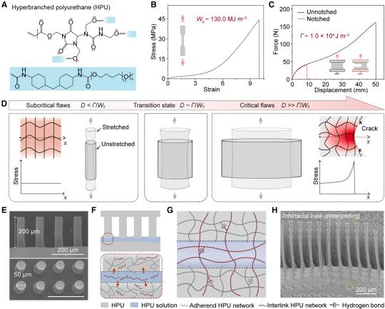 研究人员基于微纳3D打印技术成功制备出一系列不同几何参数(直径为50–800 µm,高度200 µm)的微柱模具,为高性能传感器界面的结构优化提供了核心技术支撑。首先合成了具高强度(~44 MPa)和高延展性(~1000%)的HPU弹性体材料,并系统研究了其缺陷敏感尺度。研究发现,当微柱直径小于约77 µm的材料的缺陷敏感尺度时,内部几乎无诱发裂纹扩展的临界缺陷,具备更强的应力耗散能力。当微柱直径为50 μm时,界面韧性达到了5095 J m⁻2,比传统的界面增韧方法提升了一个数量级以上。