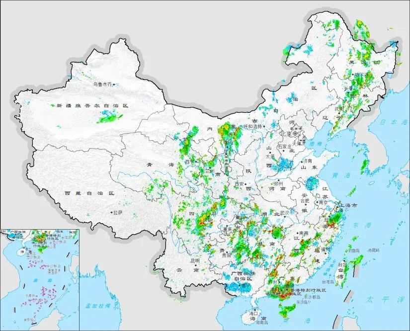 今天至14时,新疆吐鲁番盆地、陕西关中平原以及重庆局部仍有站点气温可达40℃以上,不过总体上已经处在减弱的时段。同时从卫星云图可见,西部地区上空有新的大片降水云系集结,意味着新一轮降水过程即将到来。而在川盆西部至江南华南地区,由于形势场有暖高压减弱且处在南高东侧气流辐散处,因此对流猛然乱爆,短时强降水比较激烈。中午前后,珠三角南部即深圳一带遭遇强降雨侵袭,局部区域站点小时雨量破100mm,深圳国家站点也出现了暴雨过程。而随着台风韦帕的靠近,将会拉动更多的季风水汽上岸,更大更强的暴雨过程也将会逐步展开。