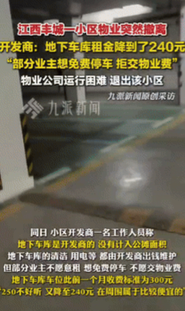 “还想白嫖?”江西一小区部分业主不愿缴纳物业费,想免费把车停在地下车库,物业崩溃撂挑子不干,既不愿意出钱买车位,又不愿意每月花240元租车位,物业决定撤离小区,不料,因物业突然离开,导致小区陷入混乱,网友:有物业闲物业,没物业了又慌了! 据九派新闻7月16日消息,事情发生在江西,车库不属于业主的公摊面积,不管是打扫卫生还是用电,统统都是开发商承担,物业公司为维护车库也是煞费苦心,可偏偏有人不配合。 小区不强制性要求业主购买车位,但只要想在小区停,就得缴纳一定费用,原本每月定价为300元,可有些业主觉得贵,为维持正常运行,物业决定后退一步,再减60元。 跟周边其他小区相比,这个价格是真不贵,但总有人不知足,执意一分钱不给,硬要把车停在车库,这对于缴纳费用的人不公平,建立车库的初衷本就是为了方便业主。 所以交钱并没错,物业也尝试进行沟通,但效果微乎其微,真是没办法了,只能走人,总不能既要服务业主,还要给他们倒贴钱吧。 可物业临走前没通知已经缴纳费用的业主,钱都没退就跑了,至少得做个交接工作,只不过没人接手,所以没法办理相关手续。 相关部门得知这事后,也在积极处理问题,找个好物业不容易,也应站在对方的角度考虑下问题,物业挣不到钱,怎么提供更好的服务? 对于这件事情,大家有什么看法?