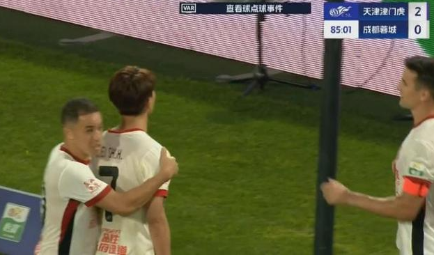 比赛第86分钟,韦世豪在禁区里被放倒,随后对着津门虎看台喋喋不休,队友把他拉了回来。随后他罚点命中。