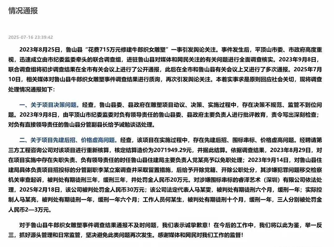 招惹牛郎织女的一众官员被处理!但是公众疑问没解除。 曾在2023年8月份被热炒的平顶山鲁山县斥巨资修建“牛郎织女”雕像问题,历经两年,终于有了结果。 有关方面通报说,鲁山县存在决策不规范、监管不到位问题,对主要负责人进行批评教育,责令写出深刻检查,诫勉谈话等处理。对鲁山县住建局主要领导党某某被免职,后被判缓刑。 事情似乎到此就结束了。但是公众疑问并没有完全打消。那就是当时网络爆料称花费的巨资为715万,经过审计实际花费207万元。通报也说明,操作过程中存在“先建后招、围标串标、价格虚高”等问题。 现在公众的疑问是,超出的500万元到了哪里去了?住建局领导被判缓刑与此有无关系?承建单位在当地还承揽了多个项目,有多少还有此类问题,造成的损失是否追回?涉及到的有关单位又是怎么处理的? 这些疑问,希望有关部门给出答复! 此事也给有些地方和部门深刻教训,没事别招惹那些神话里的人物,也别招惹那些古代的人物,小心他们来收了你。