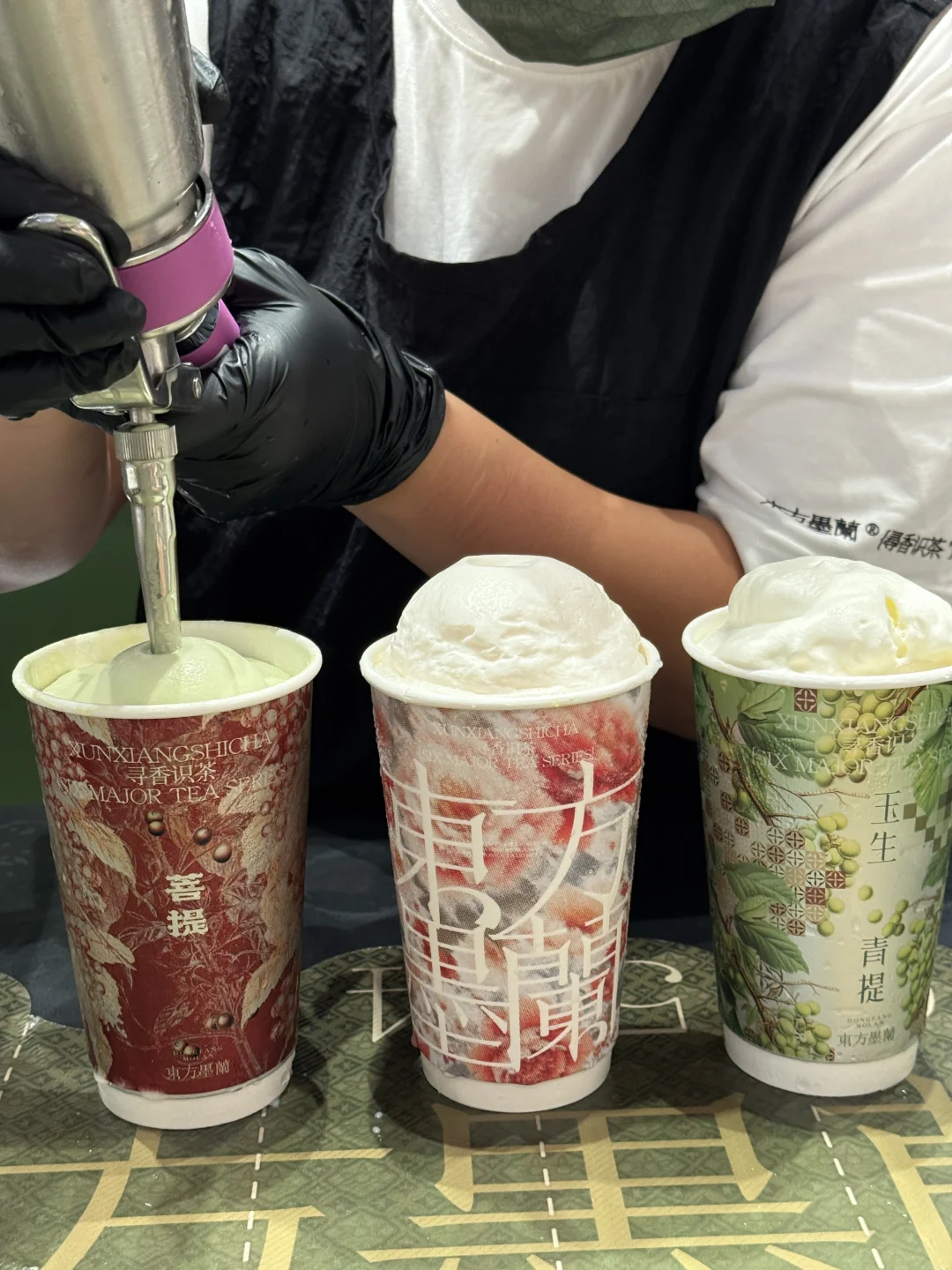 顶部加入的是悦鲜活鲜奶和开心果酱制作而成的开心果轻乳,