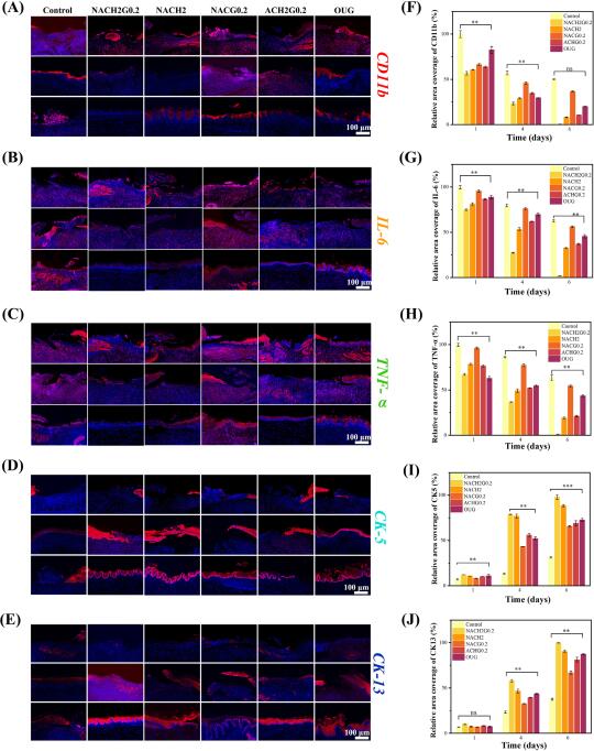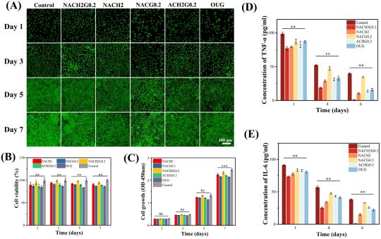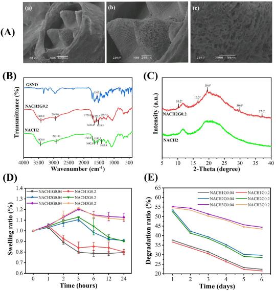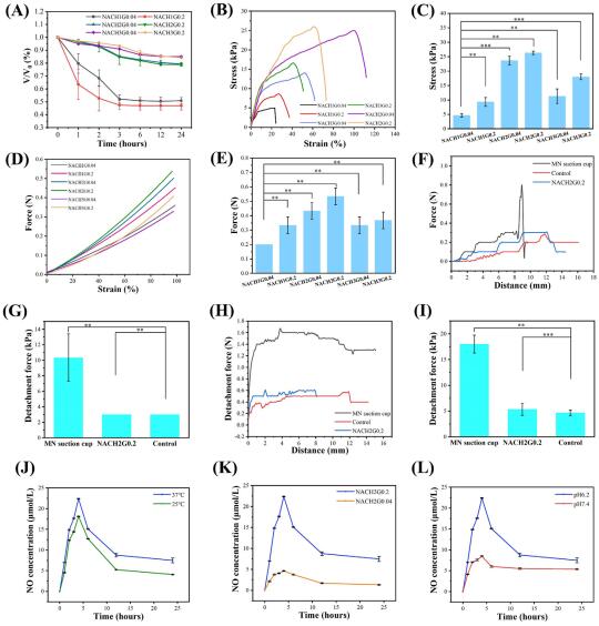 首先,选择聚乙烯醇和羧甲基纤维素钠为基质材料。PVA能与口腔粘膜形成有效的化学键,确保仿生微针贴片在潮湿的口腔环境中与组织界面形成有效的黏附;而CMC-Na可以有效改善PVA的机械性能和降解性能,使仿生微针贴片可以顺利刺入组织中。其次,向其中加入S-亚硝基谷胱甘肽和季铵盐壳聚糖。这一方面可以使仿生微针贴片释放一氧化氮以改善BIS的高炎性微环境,另一方面可以提升仿生微针贴片的抗菌性能。最后,将聚(N-异丙烯酰胺)这种智能温度响应性材料加入基质材料中,仅在生理性温度条件下控制GSNO释放的同时,自身产生收缩形变以带动创面愈合。