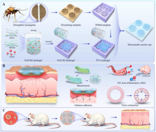 受到果蝇跗爪结构的启发,研究团队设计了一种具有仿生特性的吸盘式水凝胶微针贴片,用于BIS的高效治疗。该微针贴片制备所使用的模板是由微纳3D打印技术加工而成的。