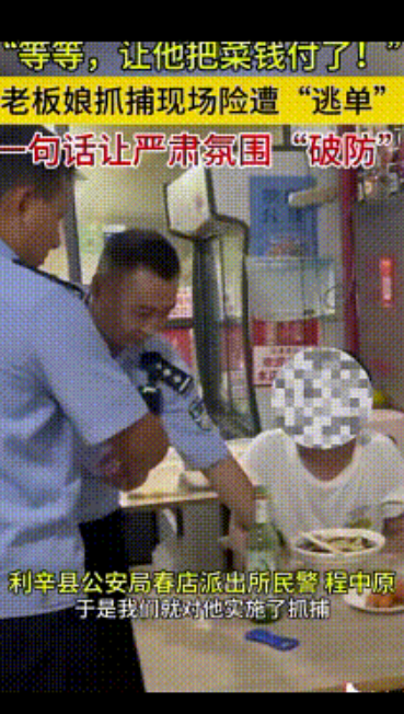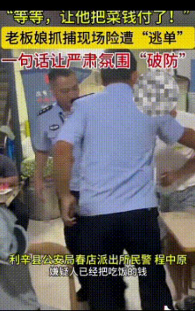 这一喊紧张的气氛突然缓解了不少,两名警察听到一脸的尴尬,他们也没想那么多,当时只想着抓人,于是赶紧赶紧回头,让嫌疑人付钱,这画面感,太逗了!嫌疑人估计也懵了,心想:“我还没吃呢,咋就抓了,还得先付钱?” 这反转,比电视剧还精彩。