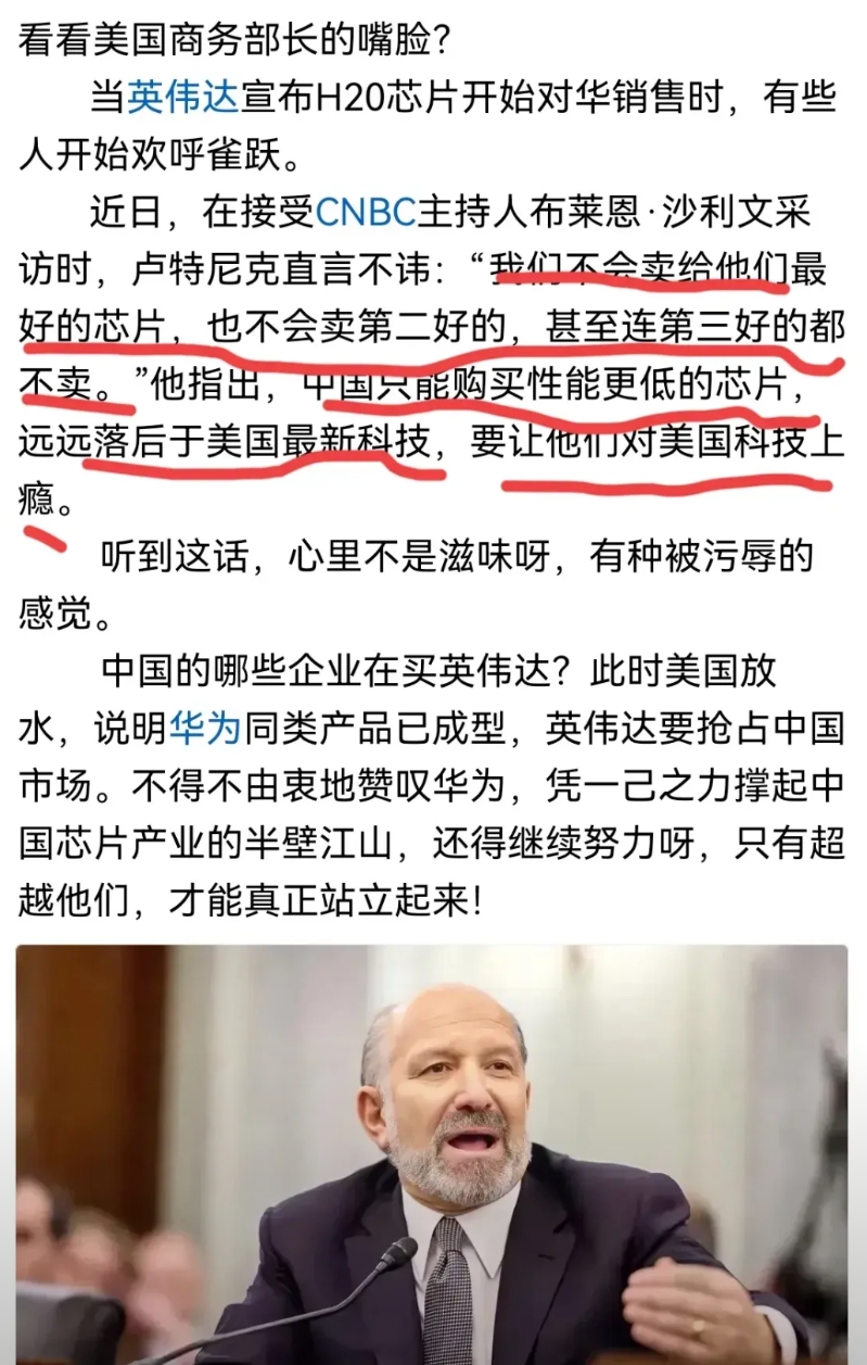 黄仁勋来中国,好话说了一箩筐,连“我是中国人,后来成美国华人”这样的奉承话都说出口。为了向中国卖芯片真是极尽所能。 还是美国商务部长卢特尼克说出心里话,“我们不会卖给他们最好的,也不会卖第二好的芯片,甚至连第三好的都不卖。”。 美国之所以放宽英伟达H2O对华销售,还不是因为华为升腾芯片研发出来了,达到甚至超过了英伟达H2O的性能。他们赶紧放出同等性能的芯片来低价倾销继续绞杀华为芯片。会有很多买办企业给美国做帮凶的。 中国不能总这么逆来顺受。没有华为拼命投入搞出升腾芯片,美国段然不会把英伟达芯片买给你。不能坐视华为芯片被扼杀在摇篮里。我认为对美国的芯片战应该采取以下策略: 1、欢迎英伟达H2O芯片进中国销售,但要加征50%关税。 2、国计民生重点安全领域不得采用外国芯片及操作系统。 3、英伟达在中国放弃H2O芯片相关专利。 如果任由英伟达在中国进出自由,在中国境内欺负人,肆意打压华为,那何谈保护民族产业?谁还会关键时刻挺身而出?