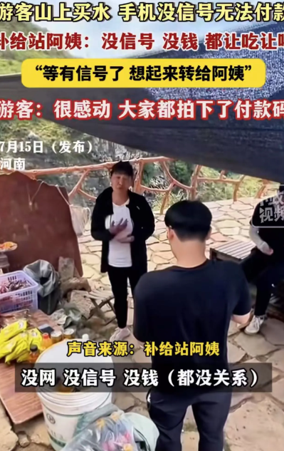太感人了!近日,河南,几名小伙去爬山,口渴到不行,看到山上居然有卖饮料的,顿时激动的不行!可是他们拿起手机想付钱的时候却尴尬了,手机没信号,身上也没现金!可是他们转身要走的时候,卖水的阿姨却喊住他们,说的话让人想哭!