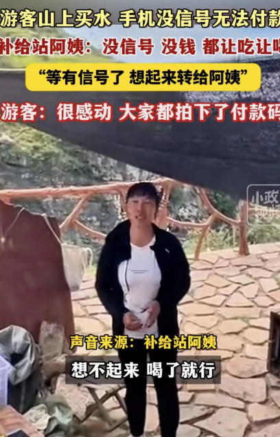 本想着把东西放回去,没想到阿姨却摆摆手,说:“没事的,水先喝着,饿了先吃,不急,你们拍个收款码,回头下山有信号了再转给我就行。”说完,还主动把水又塞回他们手里。